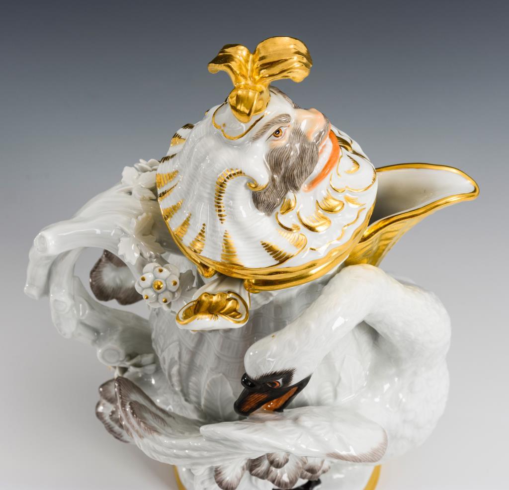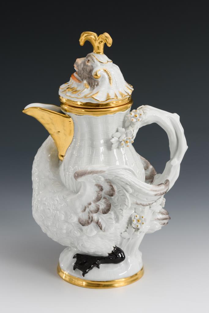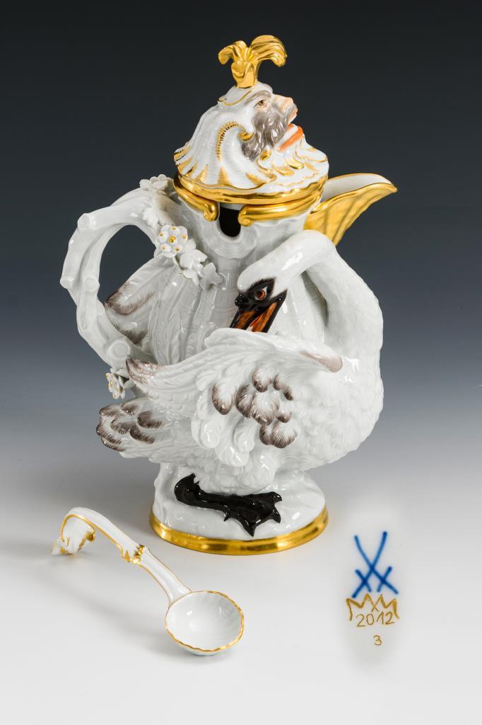In Form einer Schwanenkanne gestaltetes Gefäß mit Tierkopfdeckel und Löffelchen.