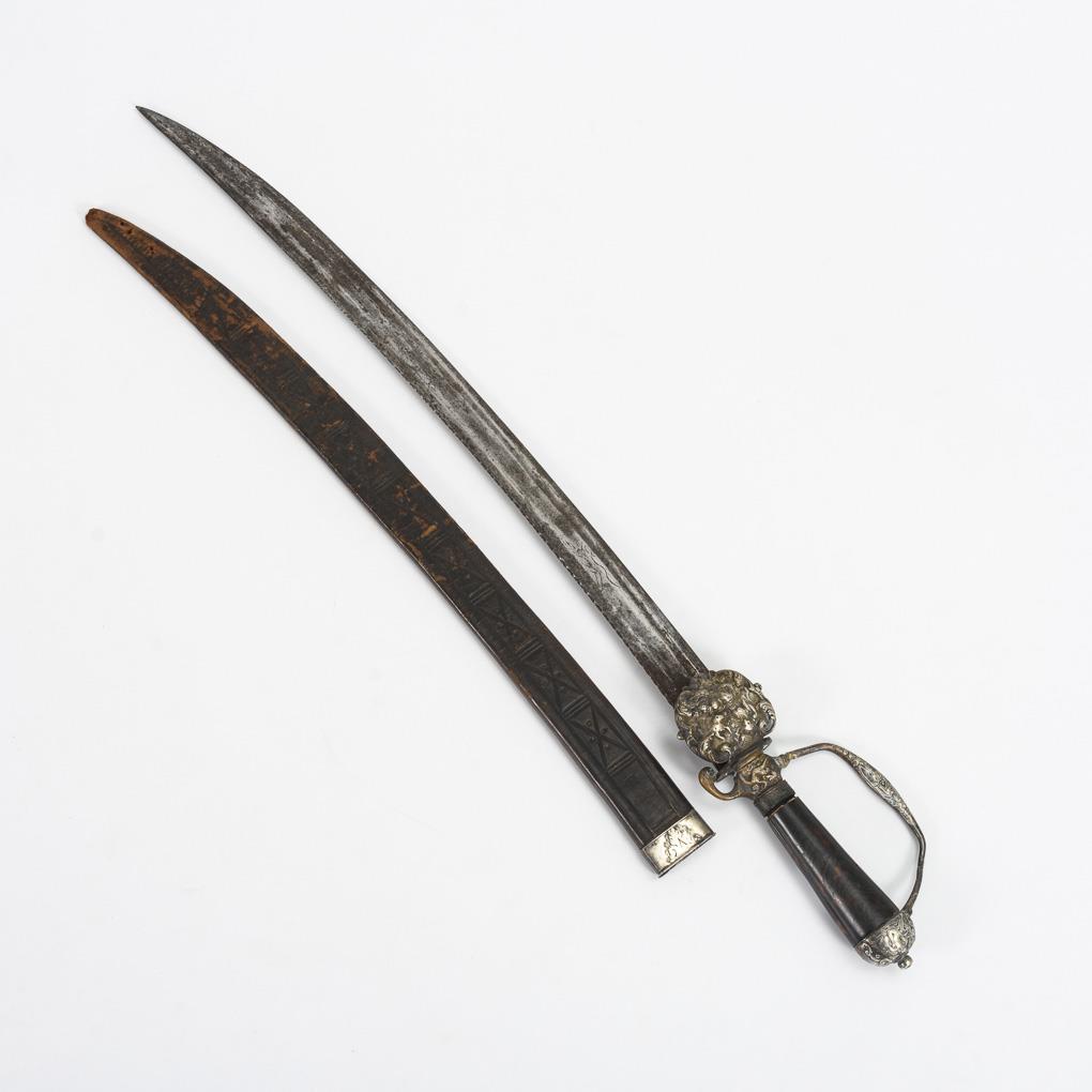 Stichblatt mit dem Raub der Europa, Kreuzstück beidseitig mit der Allegorie der Erde und Knauf beidseitig mit der Allegorie des Wassers (Flussgott) reliefiert. Bügel beidseitig mit Standfigur reliefiert. Klinge mittig gekehlt, mit 2 flankierenden Rinnen, sowie Sägerücken. Bügel gelötet, Fehlstelle am Schildpatt, Hilzenmanschette ergänzt, Scheide ergänzt, Ortblech fehlt. Starke Alters-/Gebrauchsspuren.