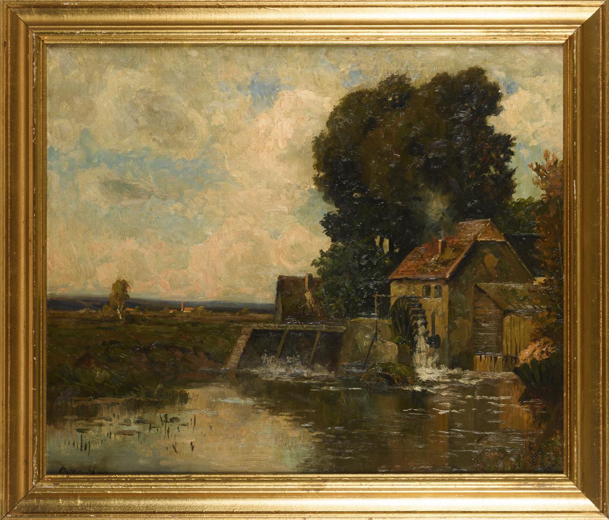 Wassermühle am Waldrand nahe einer Ortschaft mit Kirche unter leicht bewölktem Himmel. Eine sehr kleine restaurierte Stelle mit Hinterklebung.