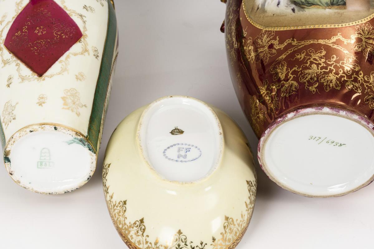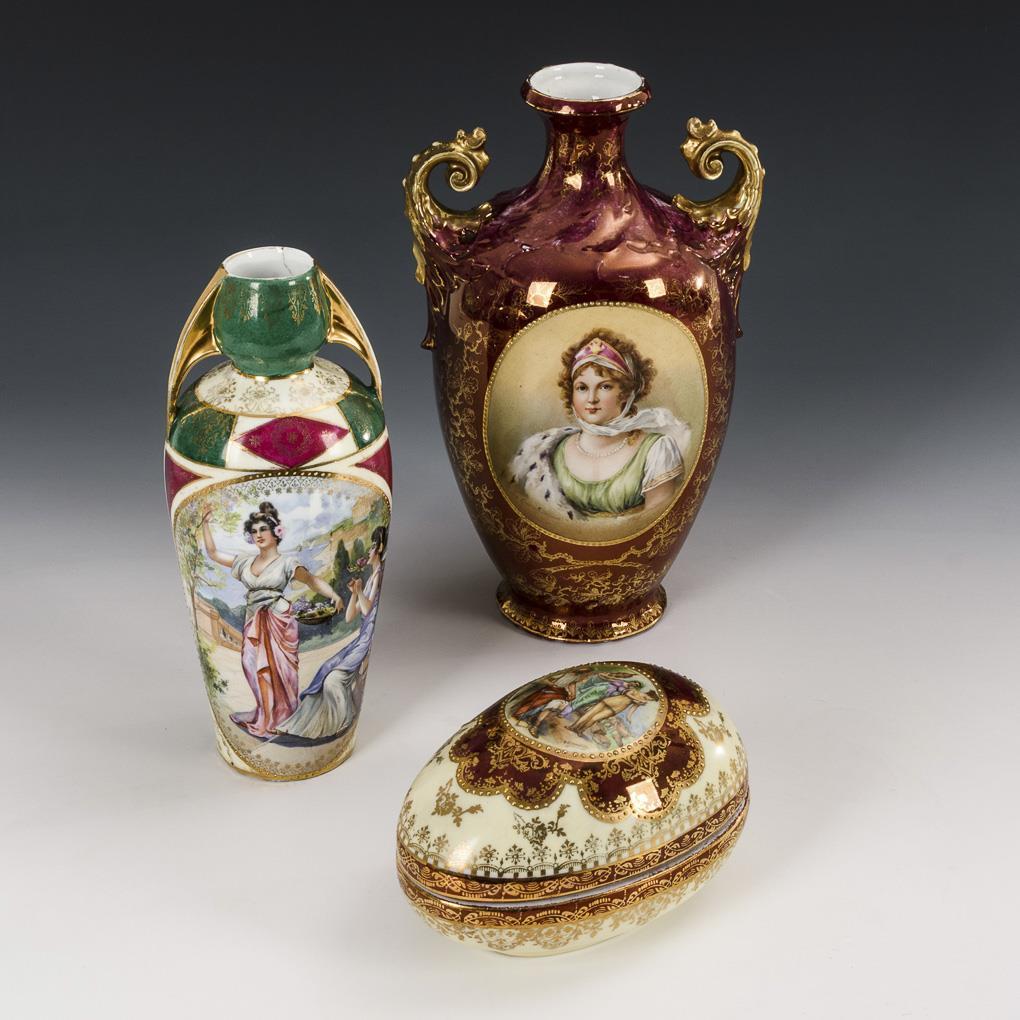 1x Vase mit dem Bildnis der Königin Luise. / 1x Vase mit der Darstellung von zwei griechischen Frauen. / 1x Ei-Dose mit dem Motiv des Urteil des Paris. Teils etwas berieben, 1x Vasenstand bestoßen, 1x 2 Wandungshaarrisse.