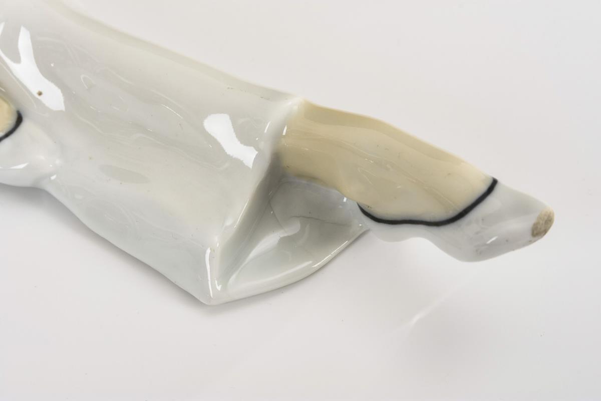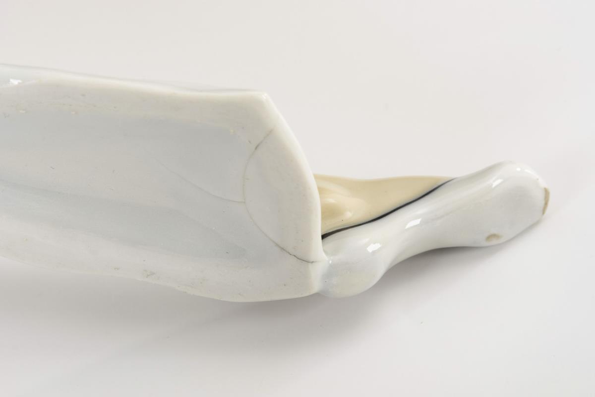 Sitzender, traurig blickender Pierrot. Rechte Fußspitze wohl beschliffen.