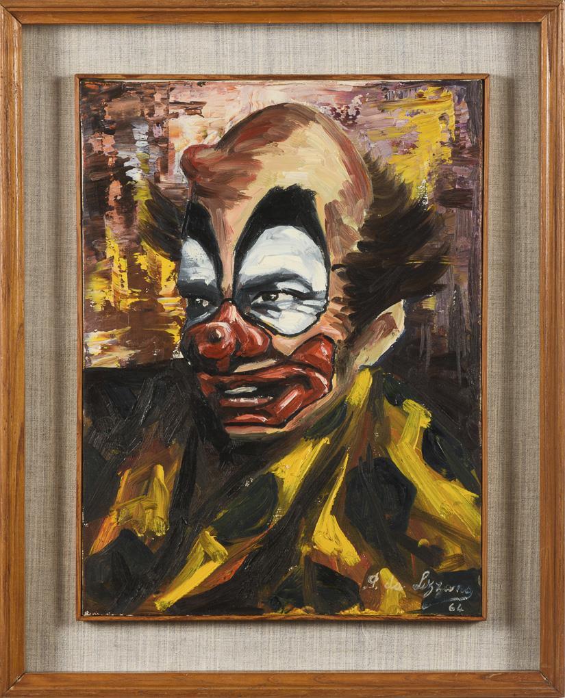 Bildnis eines Clowns mit typischer Schminke und in schwarz-gelber Kleidung.