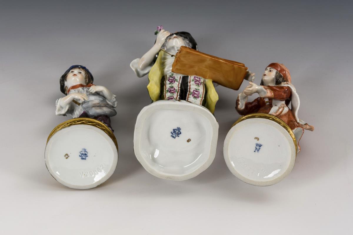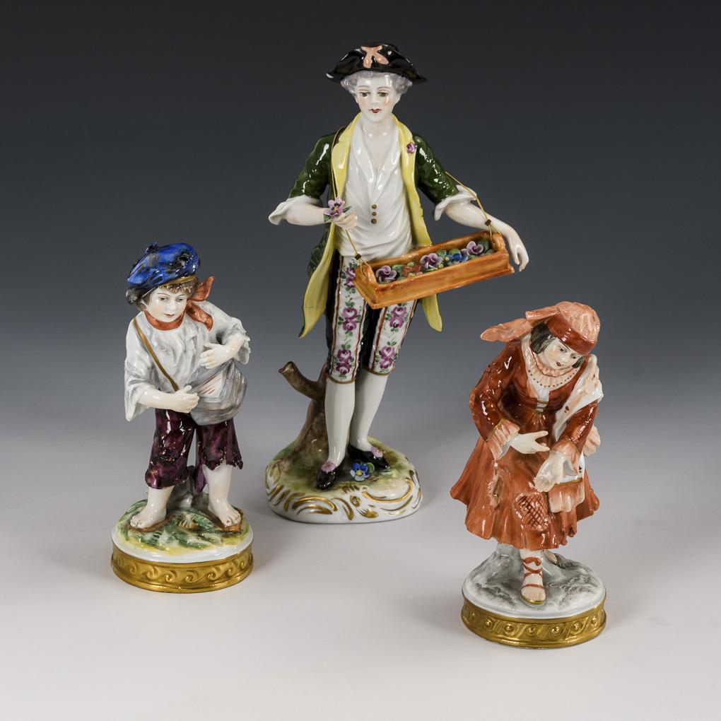1x südländisches Bettlermädchen, 1x Knabe als Briefträger und 1x Rokoko-Herr als Blumenverkäufer. Blumenverkäufer mit 2 Chips am Hutrand und geklebtem Ausbruch an der Jacke.