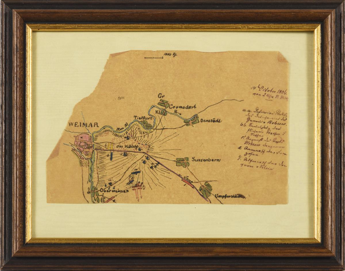 Skizzierte Schlachtsituation der Umgebung von Weimar am 14. Oktober 1806 um 2 Uhr anlässlich des Vierten Koalitionskrieges zwischen Frankreich und der Koalition aus Preußen, Russland, Großbritannien und Schweden; mit Legende - u. a. mit a) defensiver Stellung und c) Angriff der Truppen unter General Karl Georg Friedrich von Wobeser (1750 - 1823). Große Ecke oben rechts abgerissen, Blatt knickspurig.