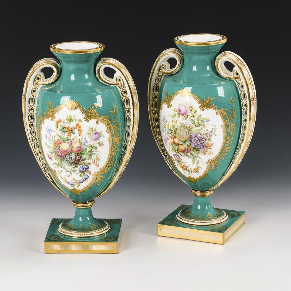 Paar Prunkvasen mit Frucht- und Blumenmalerei.