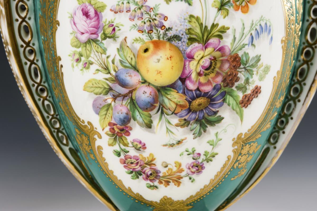 Ovoider Korpus mit zwei durchbrochenen Henkeln, Kraterhals, Rundfuß, auf Quadratplinthe. Beidseitig ein von feiner floraler Goldreliefmalerei gerahmtes Medaillon, darin je ein großes Blumenbukett mit Früchten. Chip an 1 Sockelecke, 1x minimaler Chip am Sockelrand, 1x minimale Bestoßung an 1 Sockelecke.