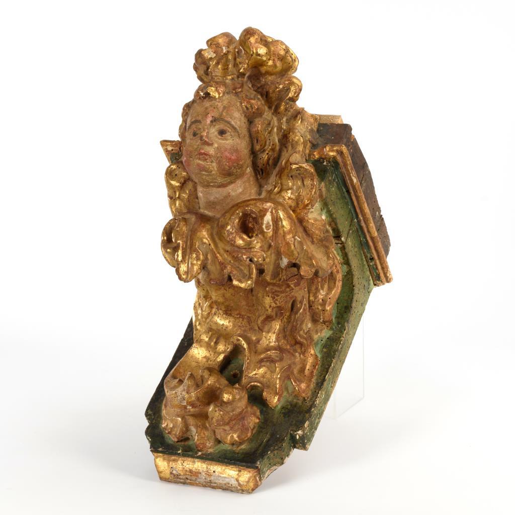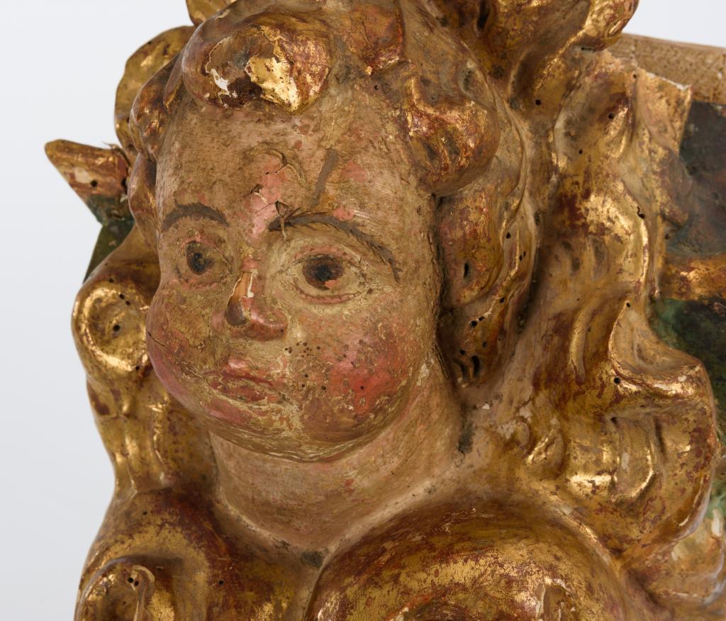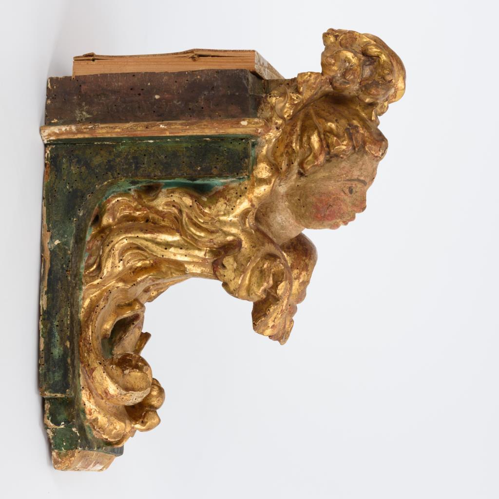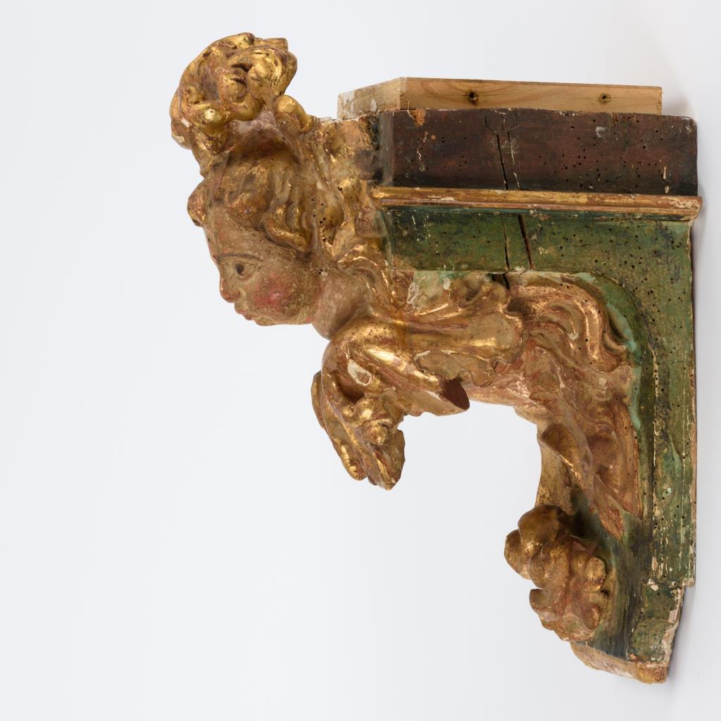 Puttokopf im stark geschwungenen Blattwerk am Konsolbrett. Trockenrisse, Anobienspuren, Bohrloch am Konsolbrett, Fassung übergangen, sehr starke Alters- und Gebrauchsspuren.