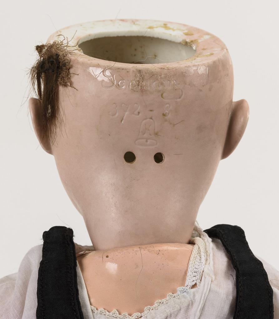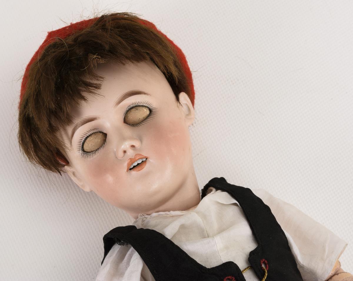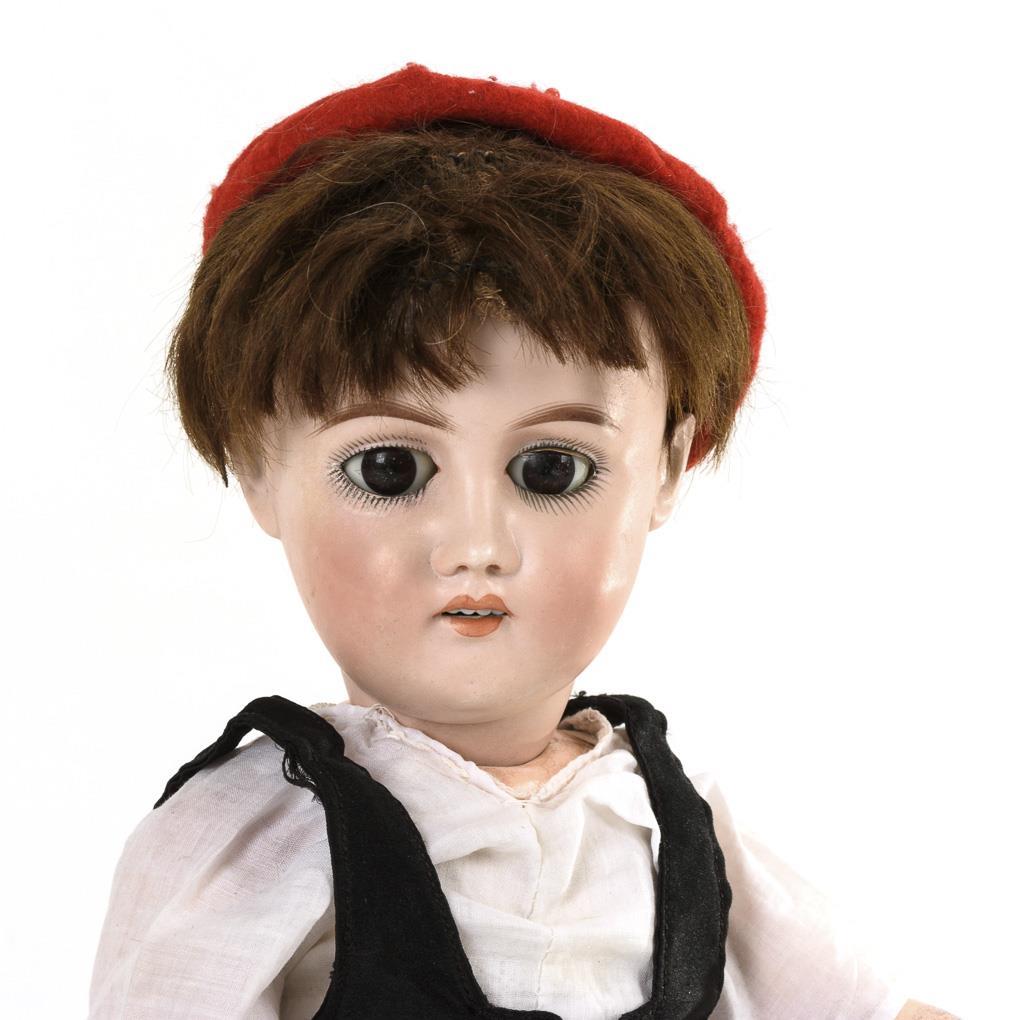 Kurbelkopf, braune Schlafaugen, braune Mohairperücke. 15-teiliger Toddlerkörper. Roter Rock, schwarzes Mieder, rote Filzkappe, schwarze Schuhe. Am rechten unteren Augenrand restauriert, ergänzter Unterschenkel rechts mit Defekten.