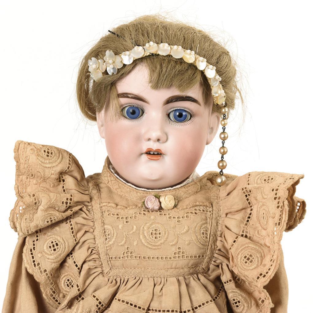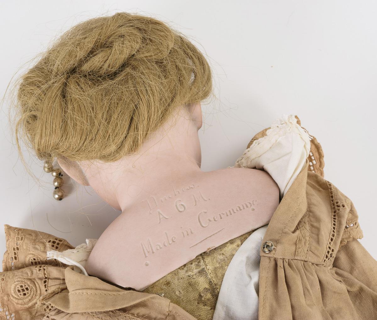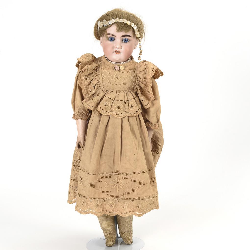 Nachgegipste blaue Augen, blonde Echthaarperücke. Lederkörper mit Unterarmen aus Biskuit, Beine mit Splintgelenken. Beiges Kleid aus alten Stoffen. Am Rückenblatt 2 winzige Randbestoßungen, rechter Arm geklebt.
