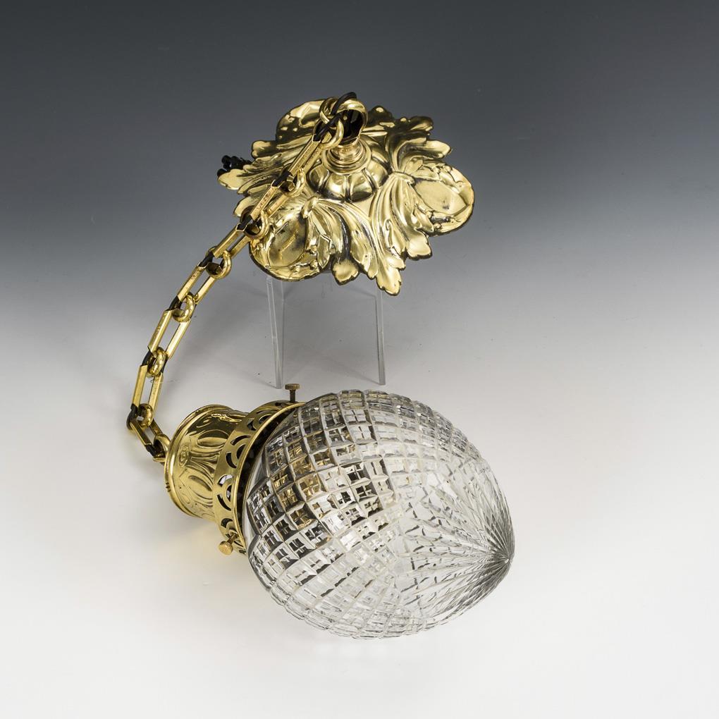 Tropfenförmige Glocke mit Steinel- und Kerbschliff; ornamental und vegetabil reliefiertes Messing. Elektrifiziert, Funktion nicht geprüft.