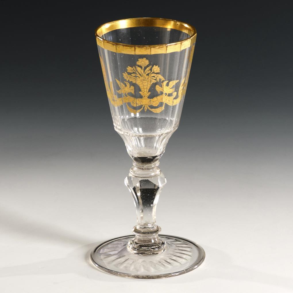 Vielfach facettierte, konische Kuppa, facettierter Schaft, Rundfuß mit Olivenschliffkranz, ausgekugelter Abriss. Schauseitig die Darstellung eines von Vögeln flankierten Blumenkorbes. Gold etwas berieben.