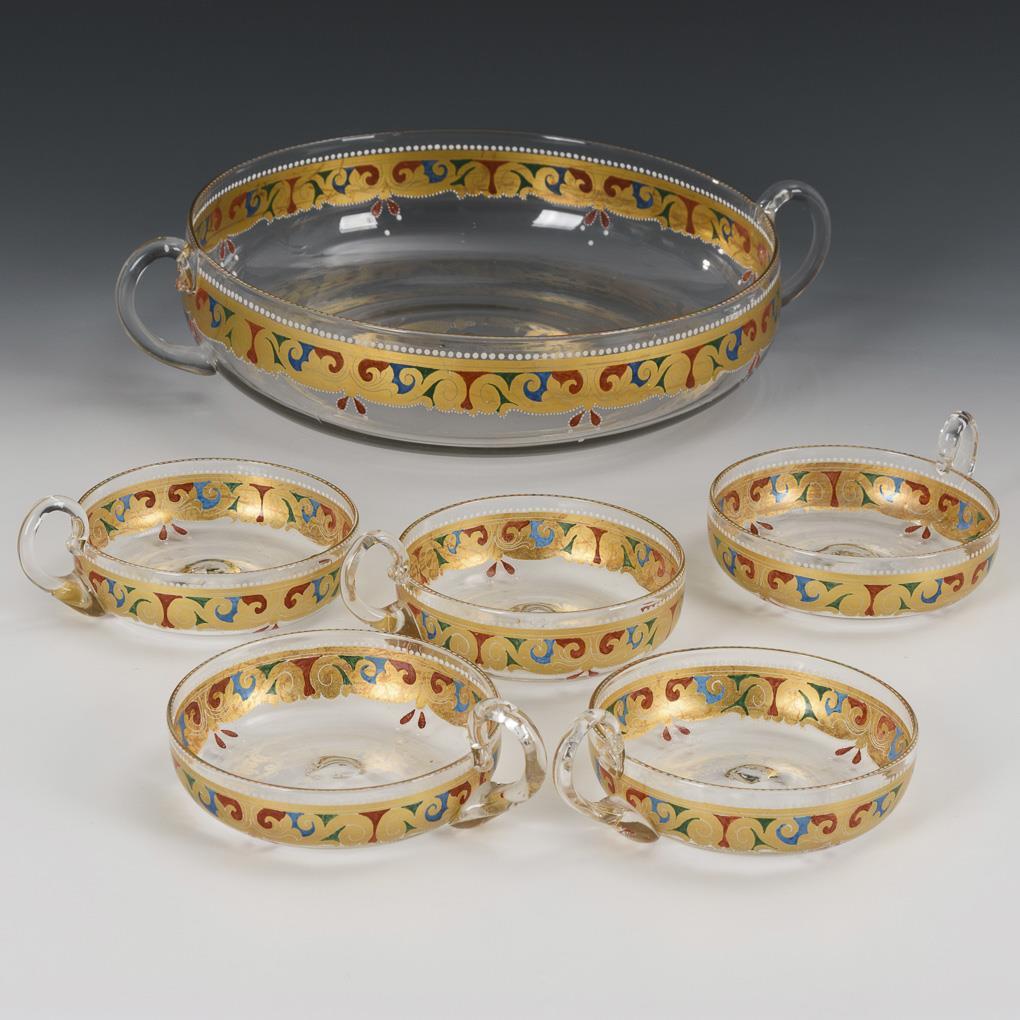 Farbloses Glas, polychrome Emailmalerei, Goldstaffage. Schale Ø 30 cm, 5 Kompottschälchen Ø 12,5 cm.
