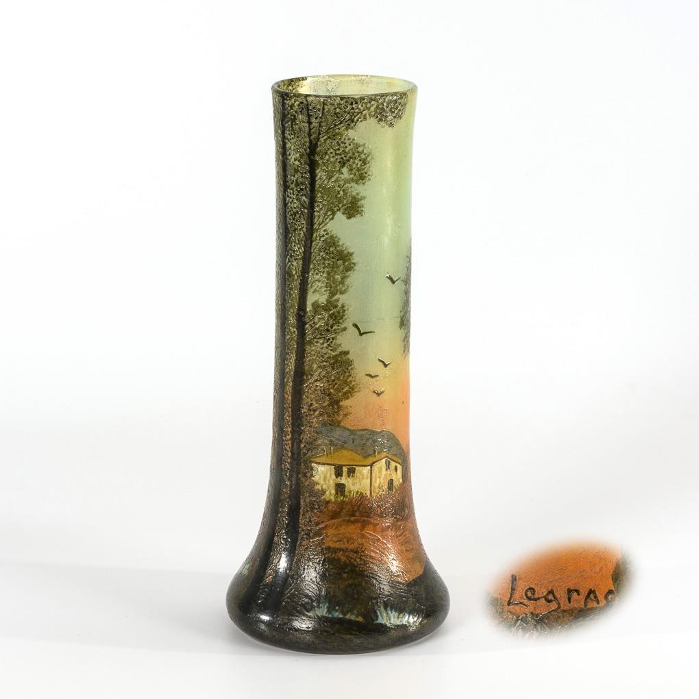 Stangenvase mit ausgestelltem Stand, ausgekugelter Abriss. Umlaufend eine geätzte und polychrom gemalte mediterrane Landschaft im Abendlicht.