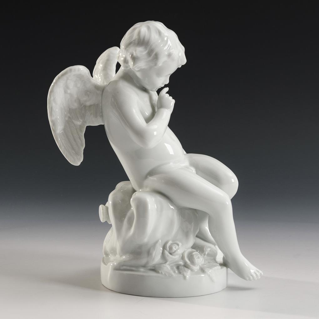 Auf einer Wolke sitzender, nachdenklicher Amorknabe.