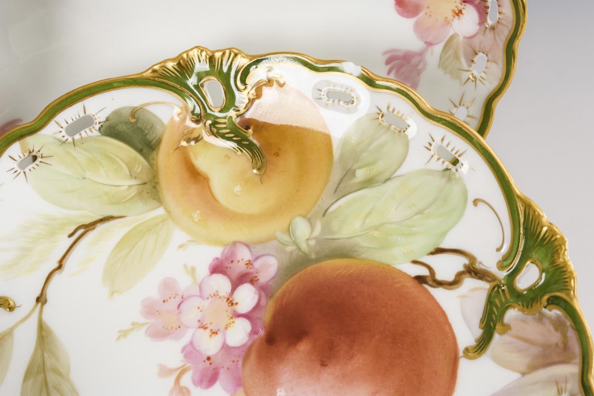 Teller mit Rocaillerelief und -durchbruch an der Fahne, im Spiegel im Stil der Weichmalerei fein gemalte Fruchtbuketts.