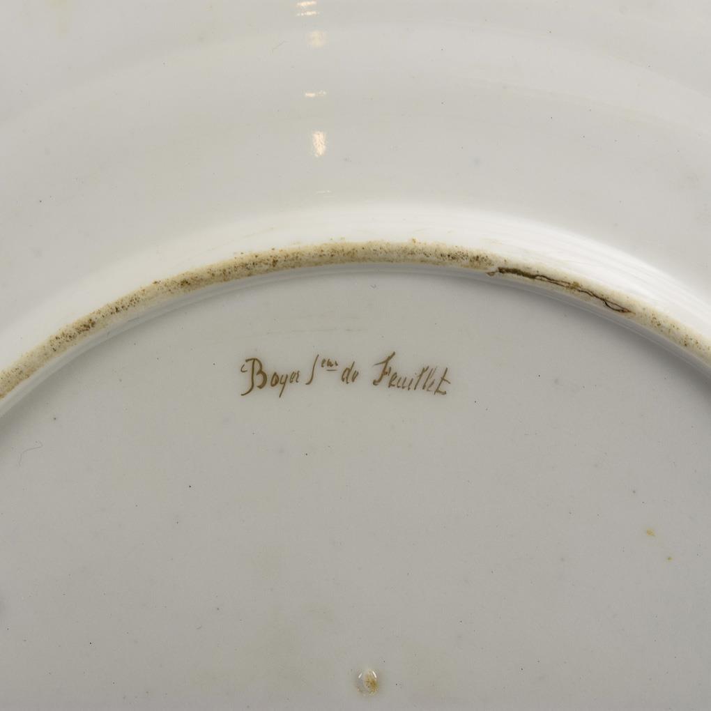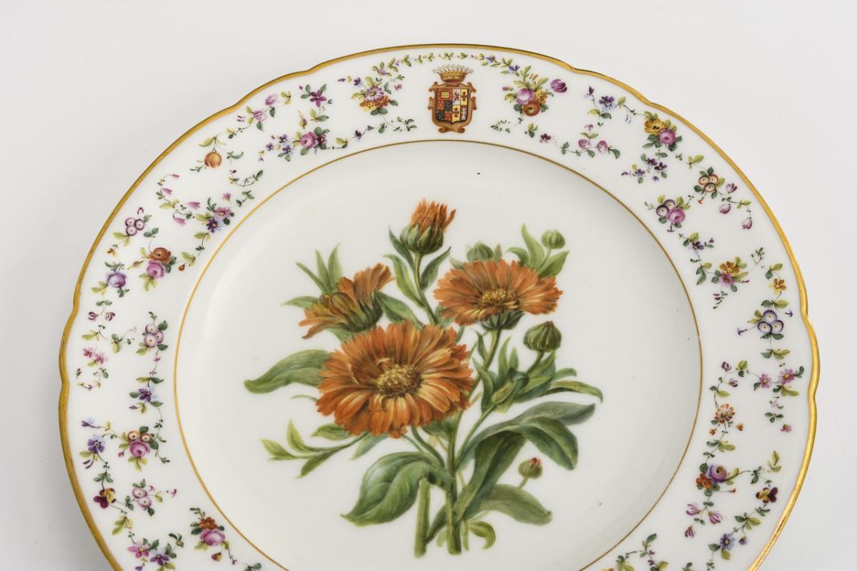 Passige Speiseteller mit einer fein gemalten, großen Pflanze im Spiegel, auf der Fahne Blütengirlanden sowie eine Wappendarstellung.