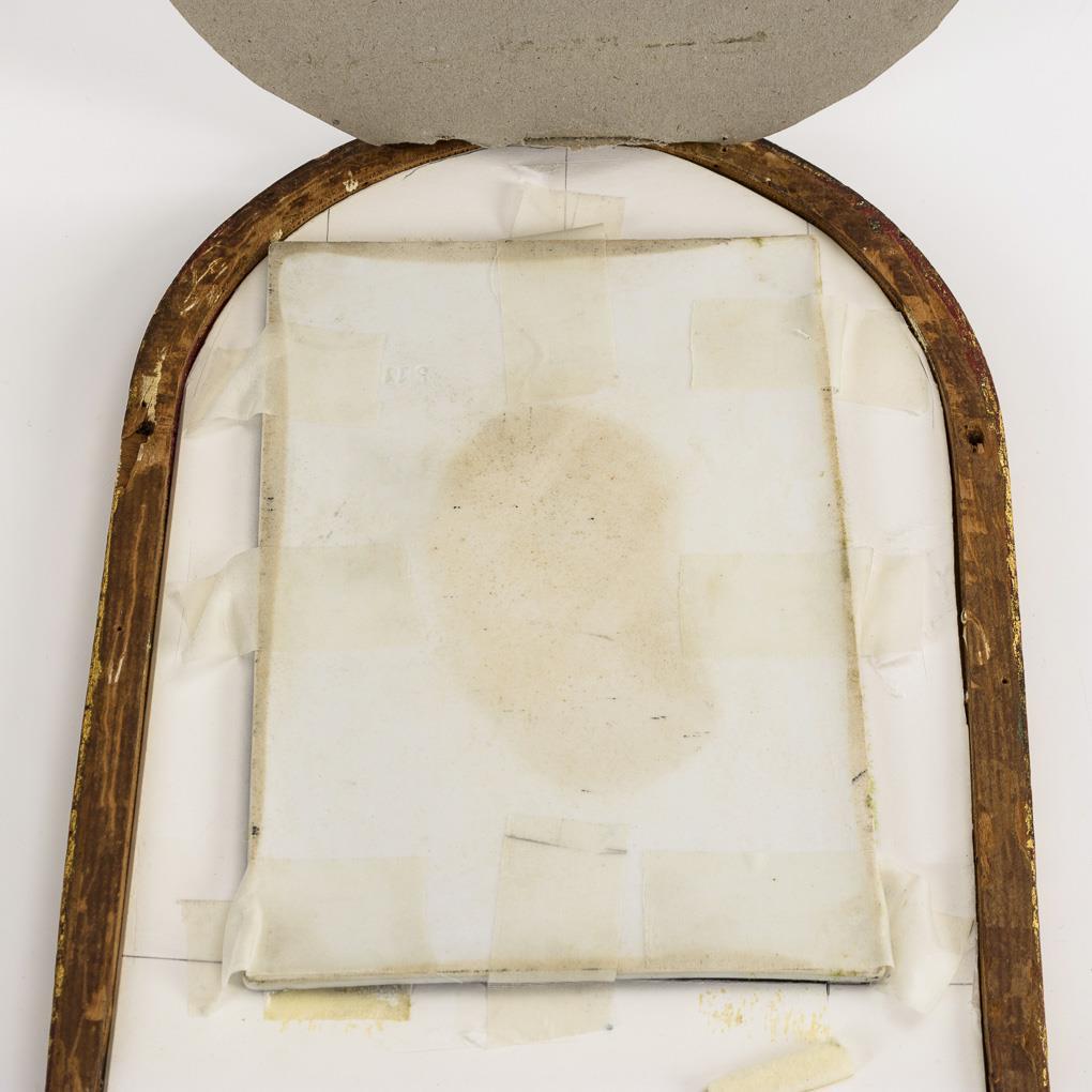 Polychrome Malerei über Vordruck. 18 x 12,5 cm, im Goldstuckrahmen (L 27 cm).