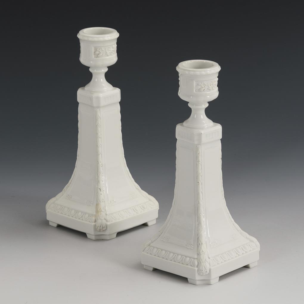 Quadratische, sich nach oben verjüngende Leuchter mit ornamentalen und floralen Biskuitreliefbändern.