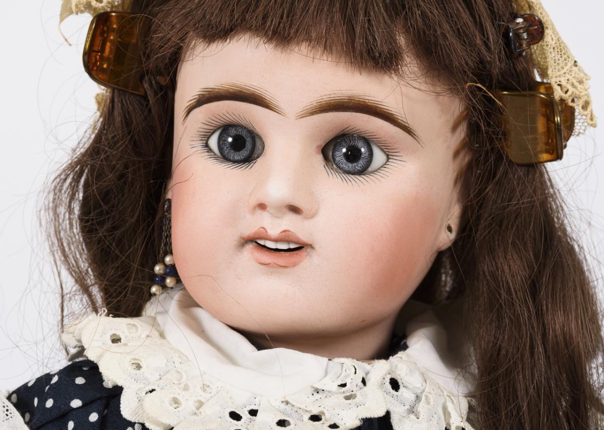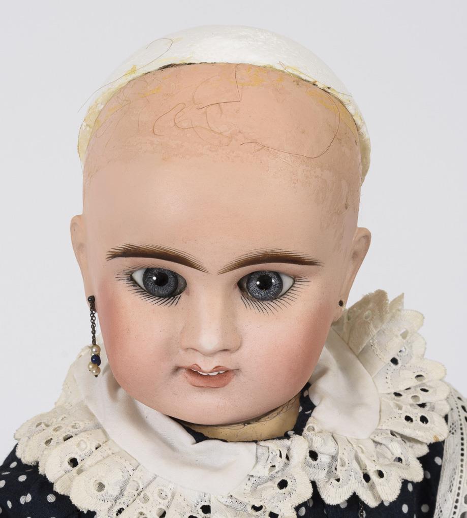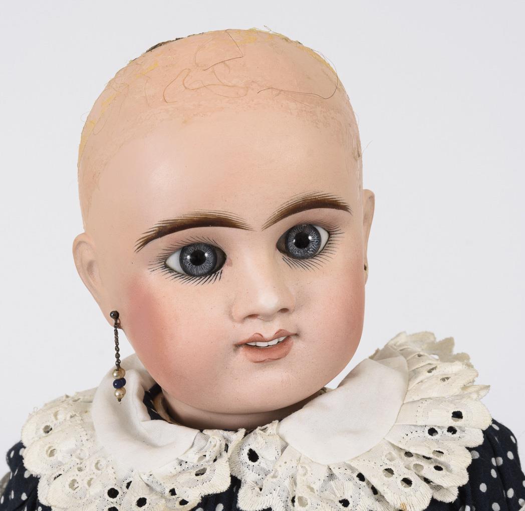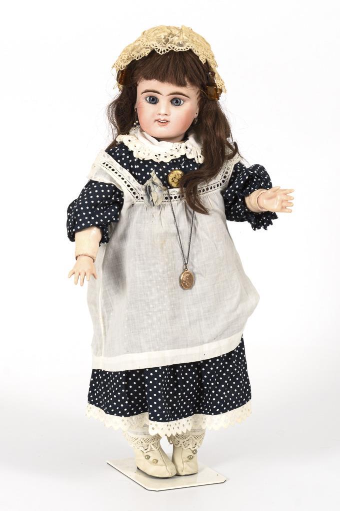 Kurbelkopf, blaue Paperweight-Augen, Zahnreihe, Ohrlöcher, braune Echthaarperücke. 11-teiliger Gliederkörper mit 2-geteiltem Torso, defekter Zugstimme und ungewöhnlichen Beinansätzen. Dunkelblaues Kleid mit weißen Pünktchen, weiße Schürze, Spitzenhaube und weiße Lederschuhe. Kopf restauriert. Körper mit (Farb-)Defekten und Reparaturen, Stimme fehlt.