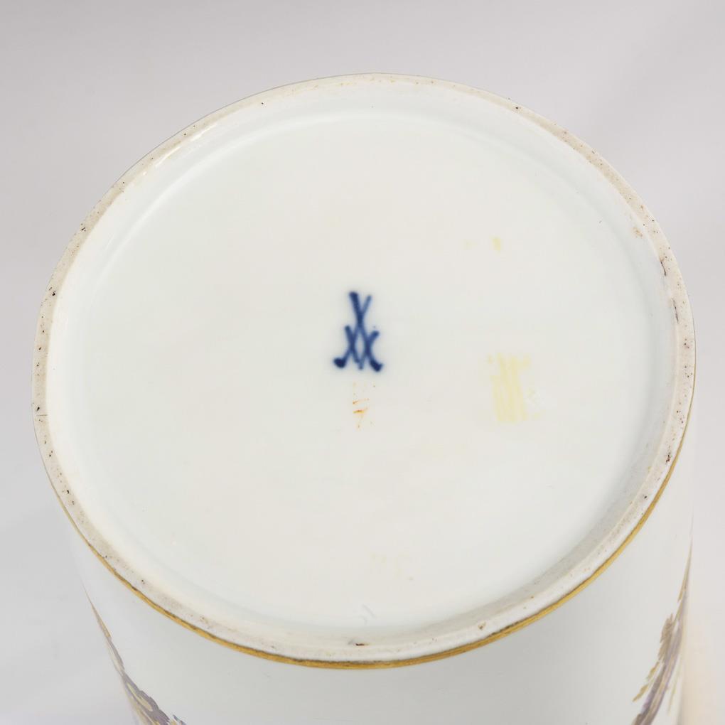 Zylindrische Kanne mit gewinkeltem Henkel und Knaufdeckel. Beidseitig ein Blumenbukett mit goldradierten Blättern und Stängeln. Henkel geklebt, minimaler Goldabrieb.