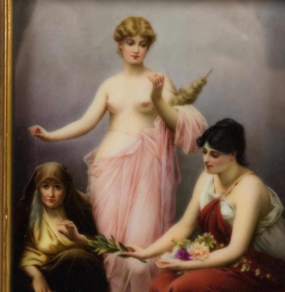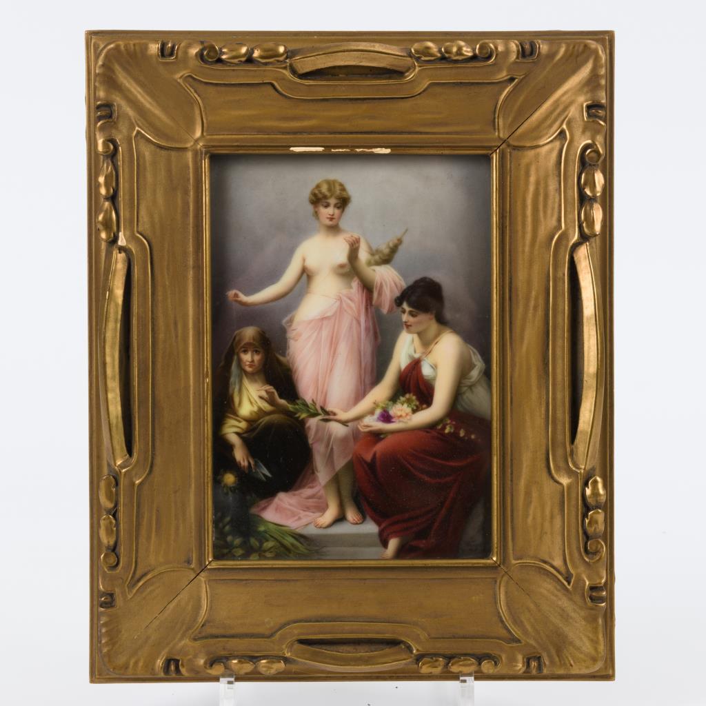 Darstellung der drei Schicksalsgöttinnen (Moiren): Zwischen der die Länge des Lebensfadens bemessenden Lachesis mit Lorbeerzweig und Blumenbukett sowie der den Lebensfaden durchtrennenden Atropos steht die jugendliche, den Lebensfaden spinnende Klotho mit Spindel; nach einem Gemälde des Malers Friedrich Paul Thumann (1834-1908).