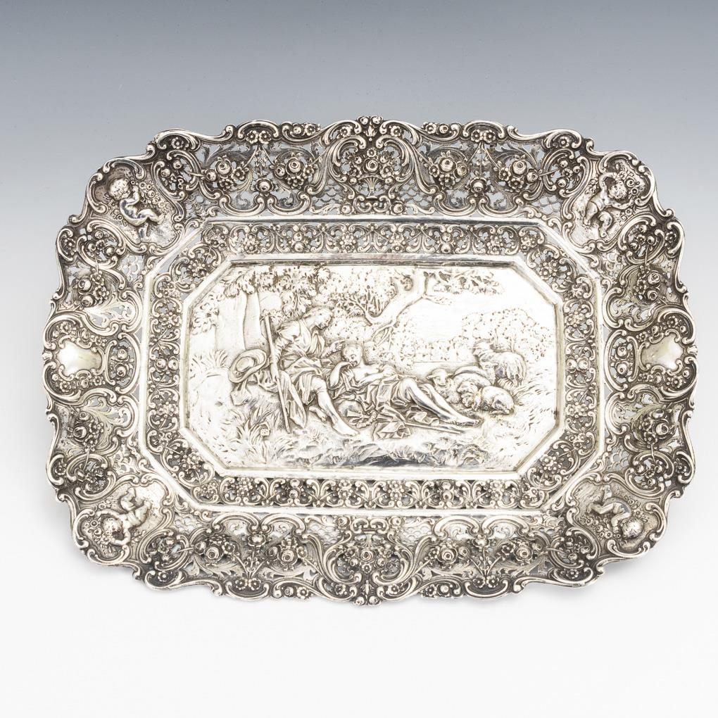 Reich verzierte, flache Anbietschale mit durchbrochenem Rand.