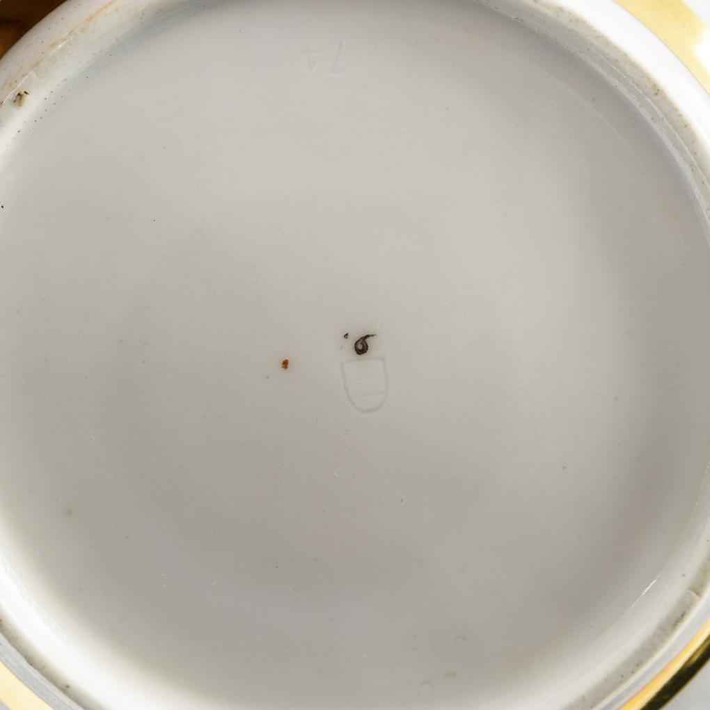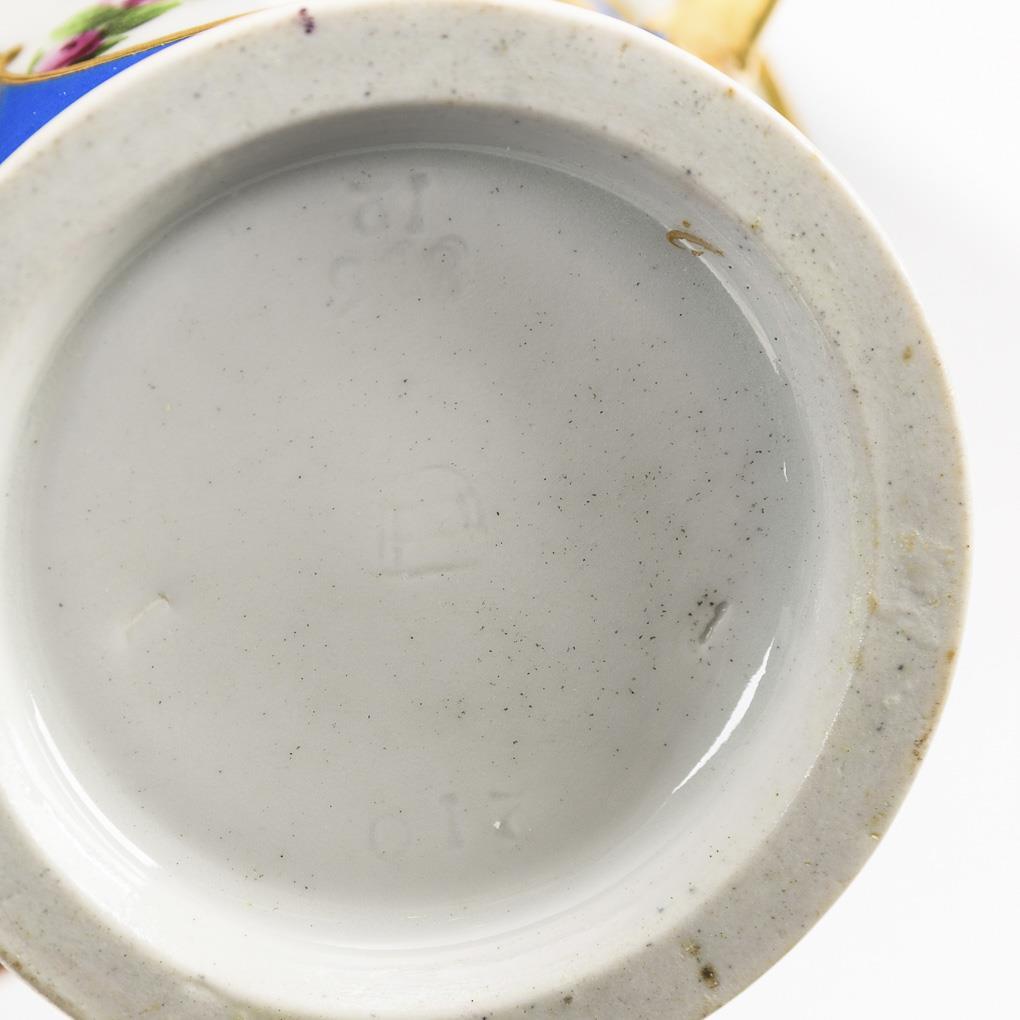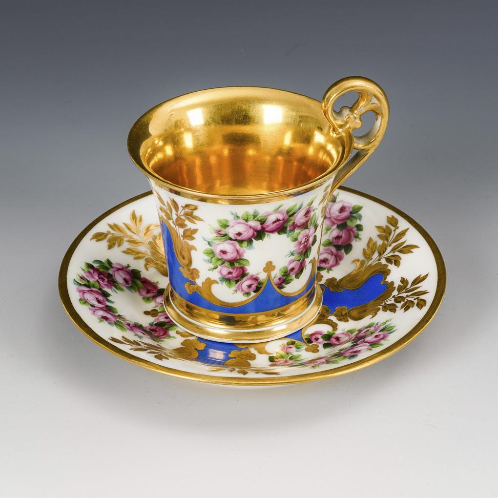 Polychrom bemalt, goldstaffiert und -graviert. H Tasse 9,5 cm, Ø originale Untertasse 15,5 cm.