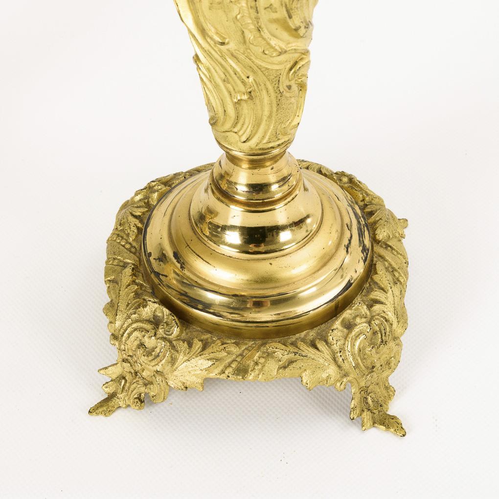 Im Stil des Barock reich reliefierte Kerzenleuchter mit schlankem Vasenschaft und erhöhter Zentraltülle. Einige wenige Alters-/Gebrauchsspuren.