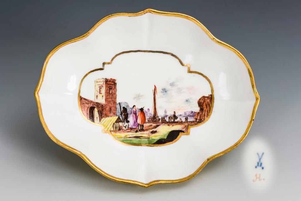 Oval-vierpassige Schale. Im Spiegel eine Vierpasskartusche mit einer Hafenszene, gelber Teilfond. 1 Wandungsrestaurierung.