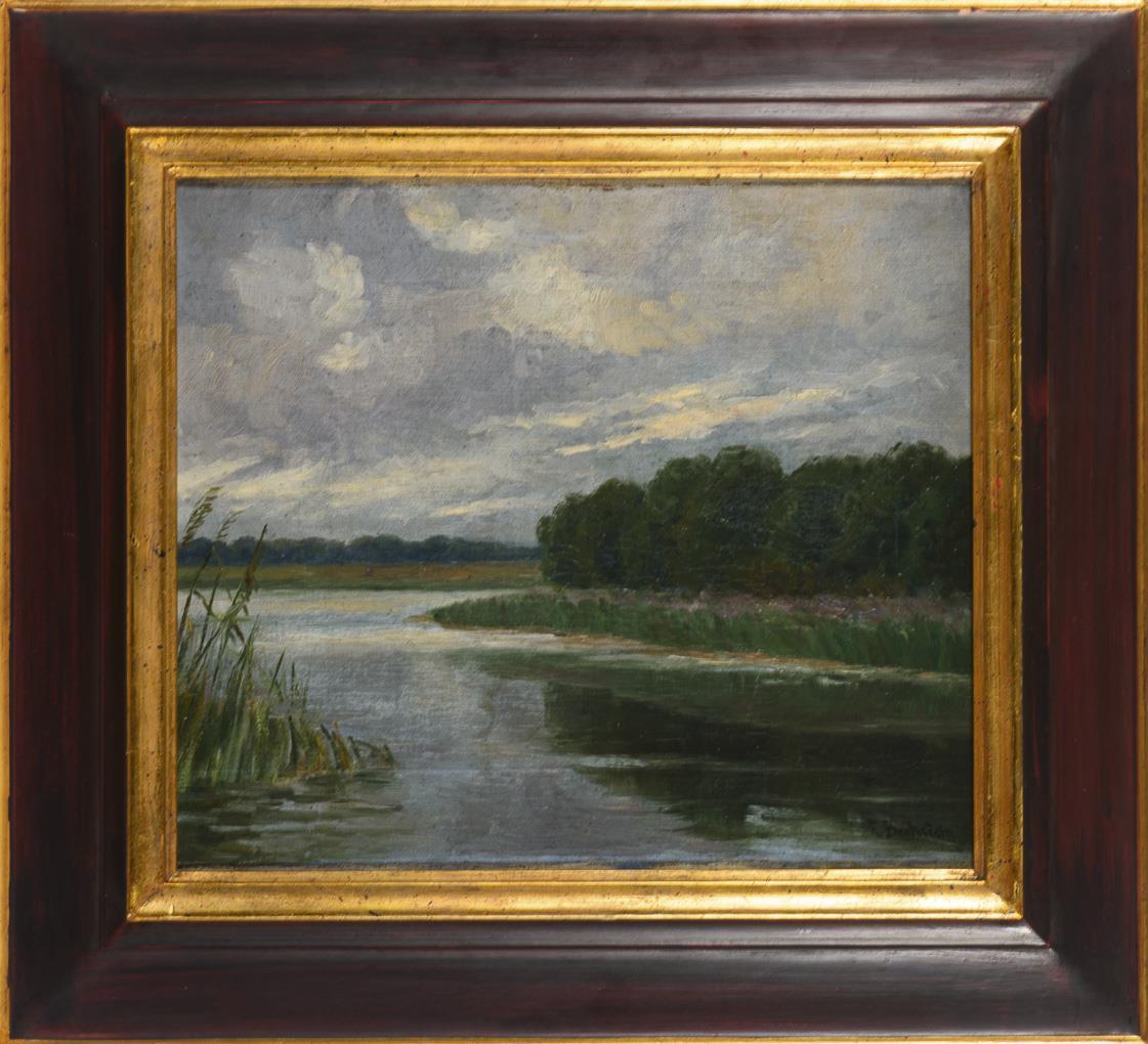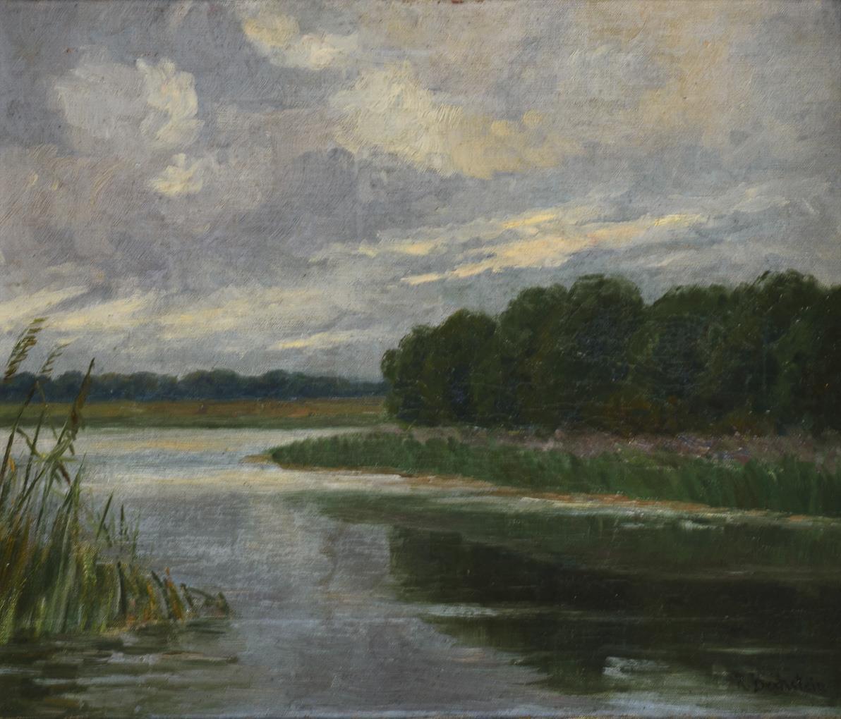 See mit Schilf und angrenzendem Wald unter wolkigem Himmel. Minimale Altersspuren.