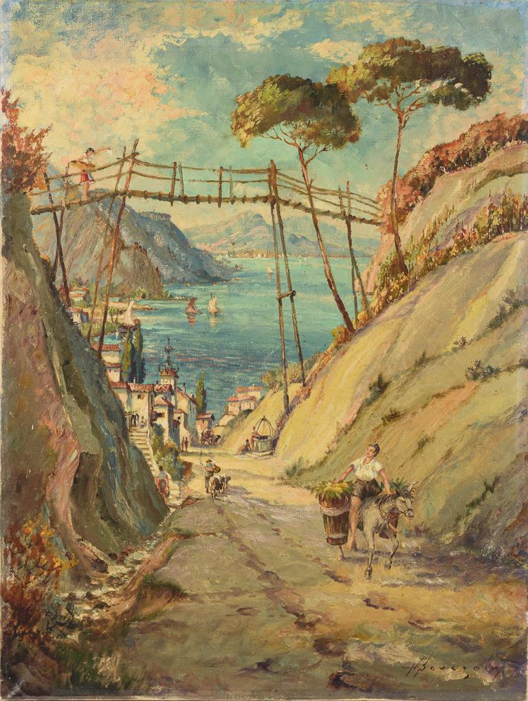 Bergige Küstenlandschaft mit Staffagefiguren auf den Straßen im Sonnenschein. Leichte Altersspuren.