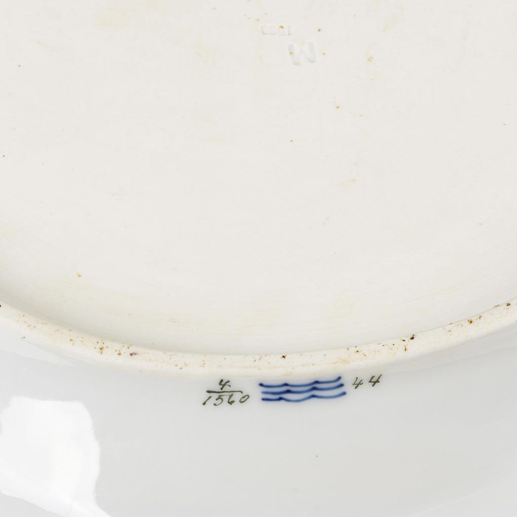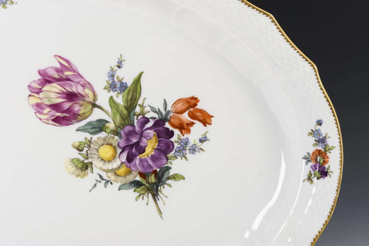 Form "Neuozier". Ovale Platte mit einem Blumenbukett mit Tulpe im Spiegel sowie kleinen Blumenbukett und -stängen im Spiegel und auf der Fahne.