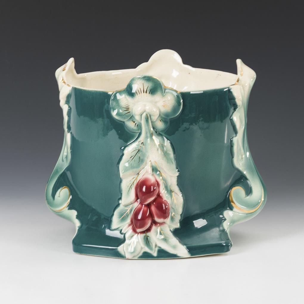 Jugendstil-Übertopf mit teilplastischem Blatt- und Fruchtdekor. Faiencerie de Nimy.