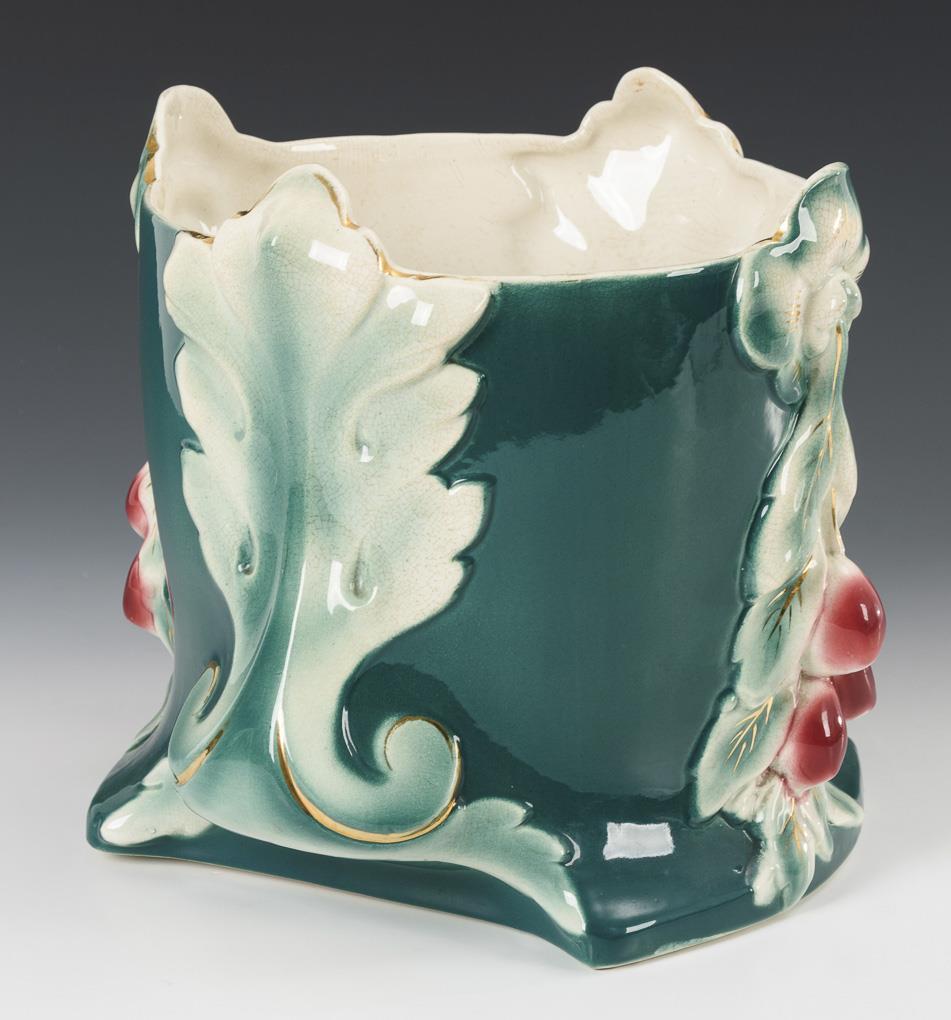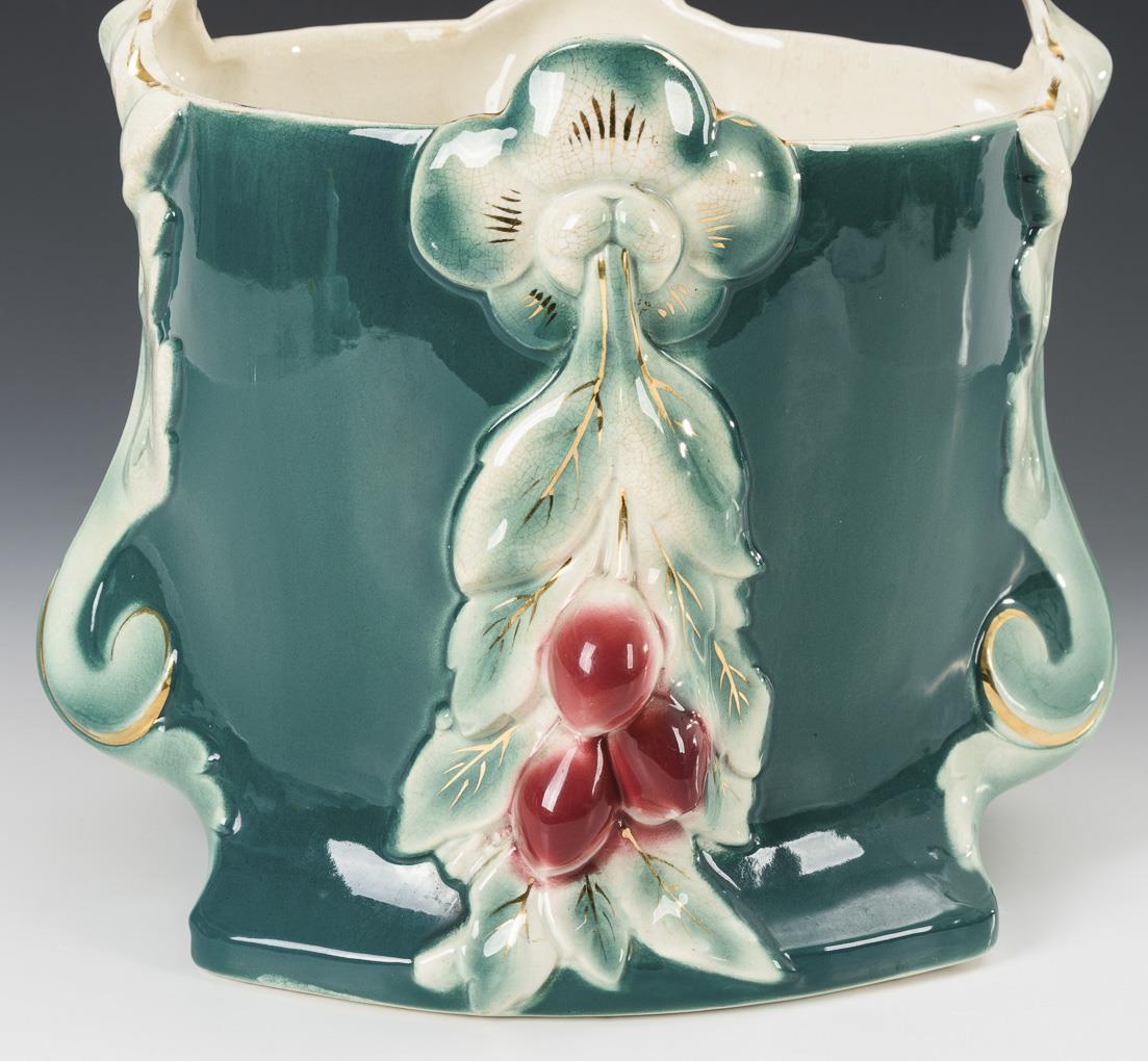 Jugendstil-Übertopf mit teilplastischem Blatt- und Fruchtdekor. Faiencerie de Nimy.
