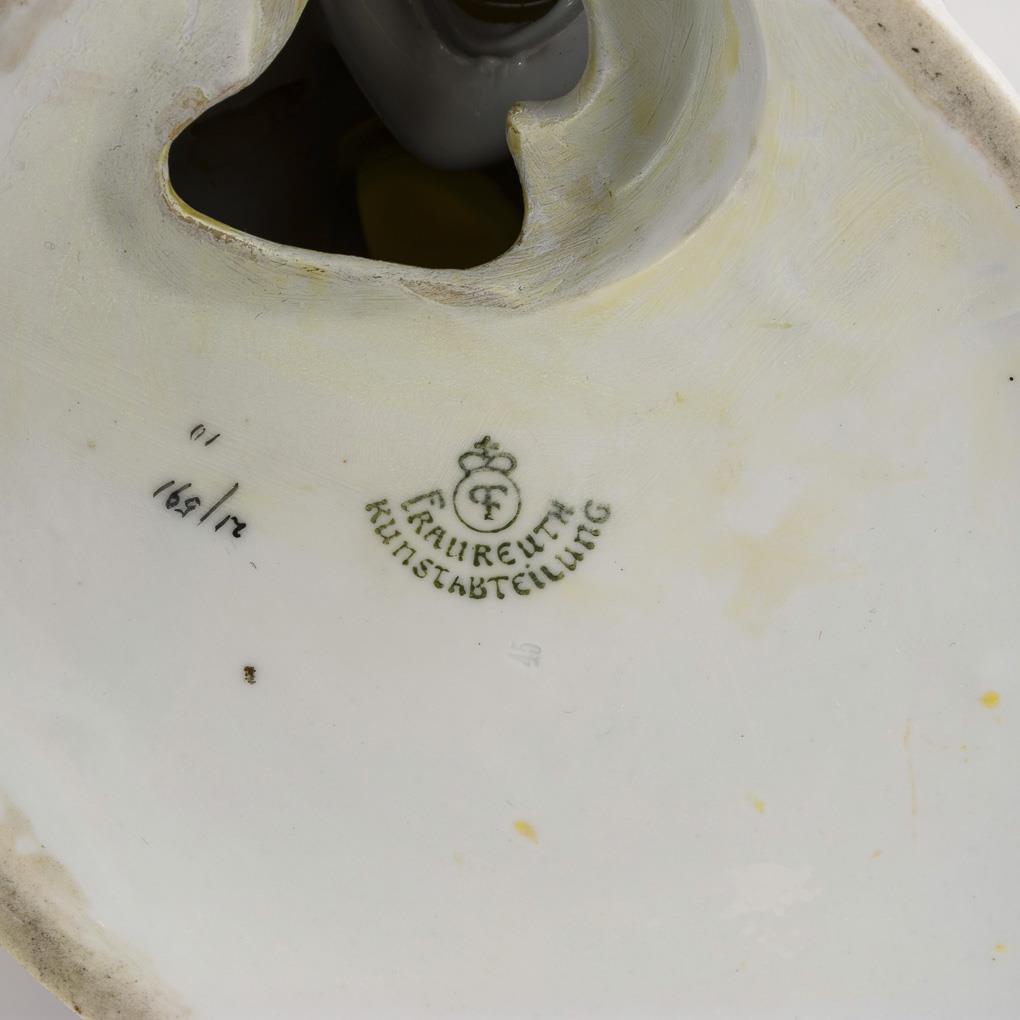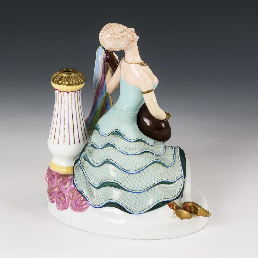 An einer Balustersäule als Lampenhalterung sitzende Tänzerin mit Mandoline. Sockel unterseitig, linke Hand, rechter Arm und beide Füße restauriert.