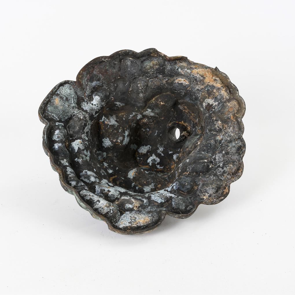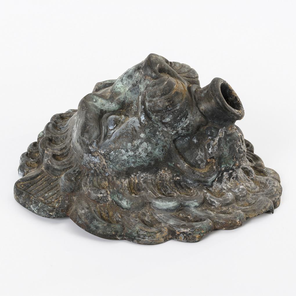 Ausdrucksstarker Löwenkopf mit großem Rohrstutzen als "Wasserspeier" von einem Brunnen. Ausbruch am unteren Rand, grünliche Patina, Kalkablagerungen.