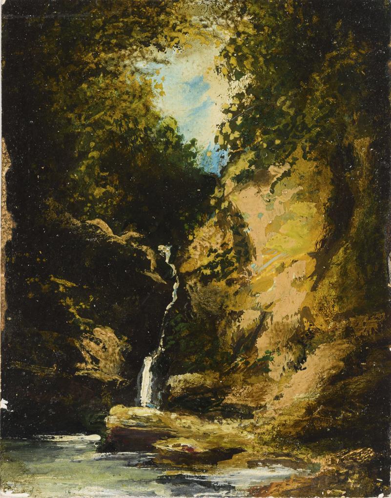 An Spitzweg erinnernde kleine Studie mit schmalem Wasserfall im Sonnenschein im Inneren des Waldes. Farbabsplitterungen an den Rändern.