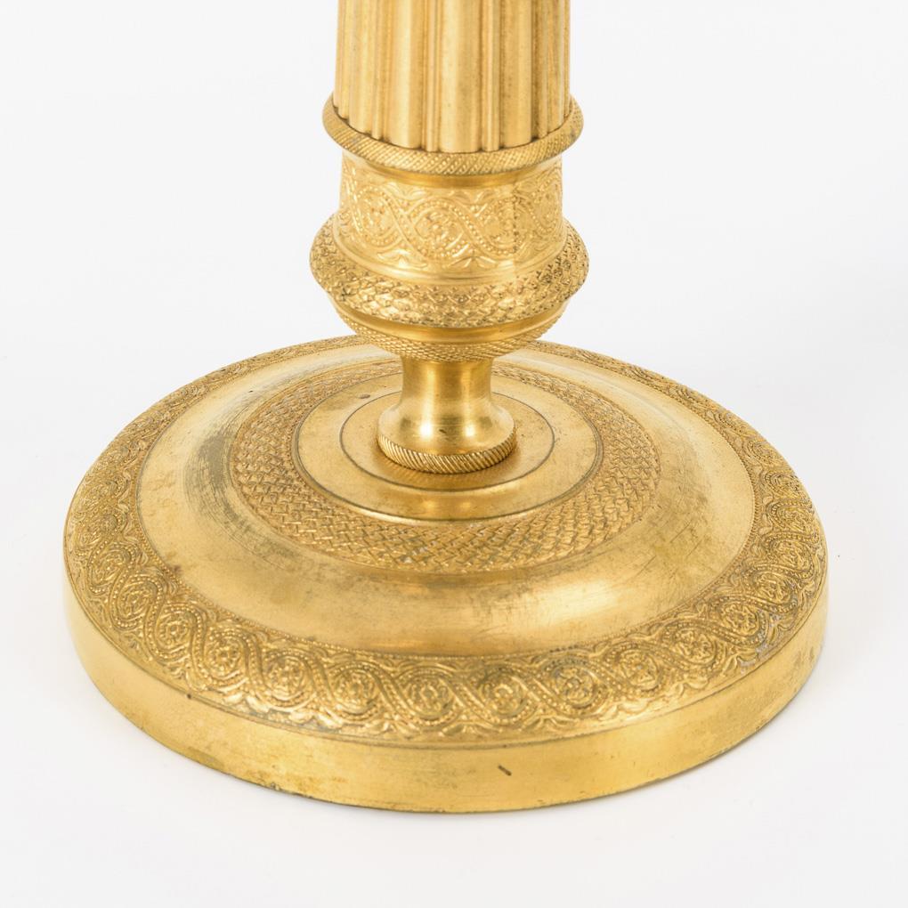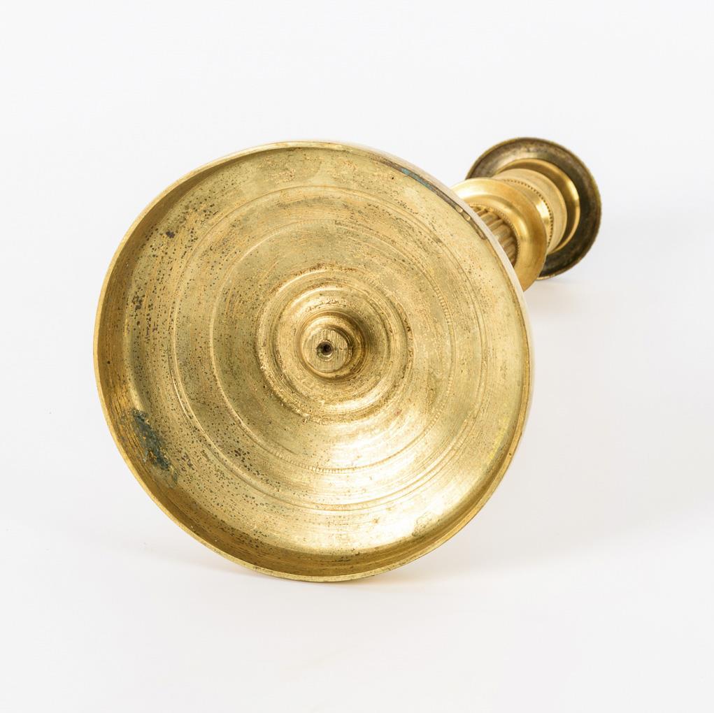 Bronzeleuchter mit feinem Reliefornament sowie geriffeltem Schaft.