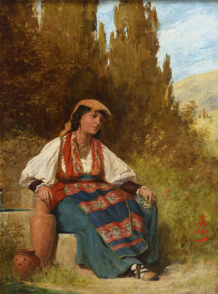 Junge südländische Frau in Tracht im warmen Sonnenschein, mit Amphoren, am Ufer eines Gewässers in Gedanken versunken. Eine kleine restaurierte Stelle mit Hinterklebung.