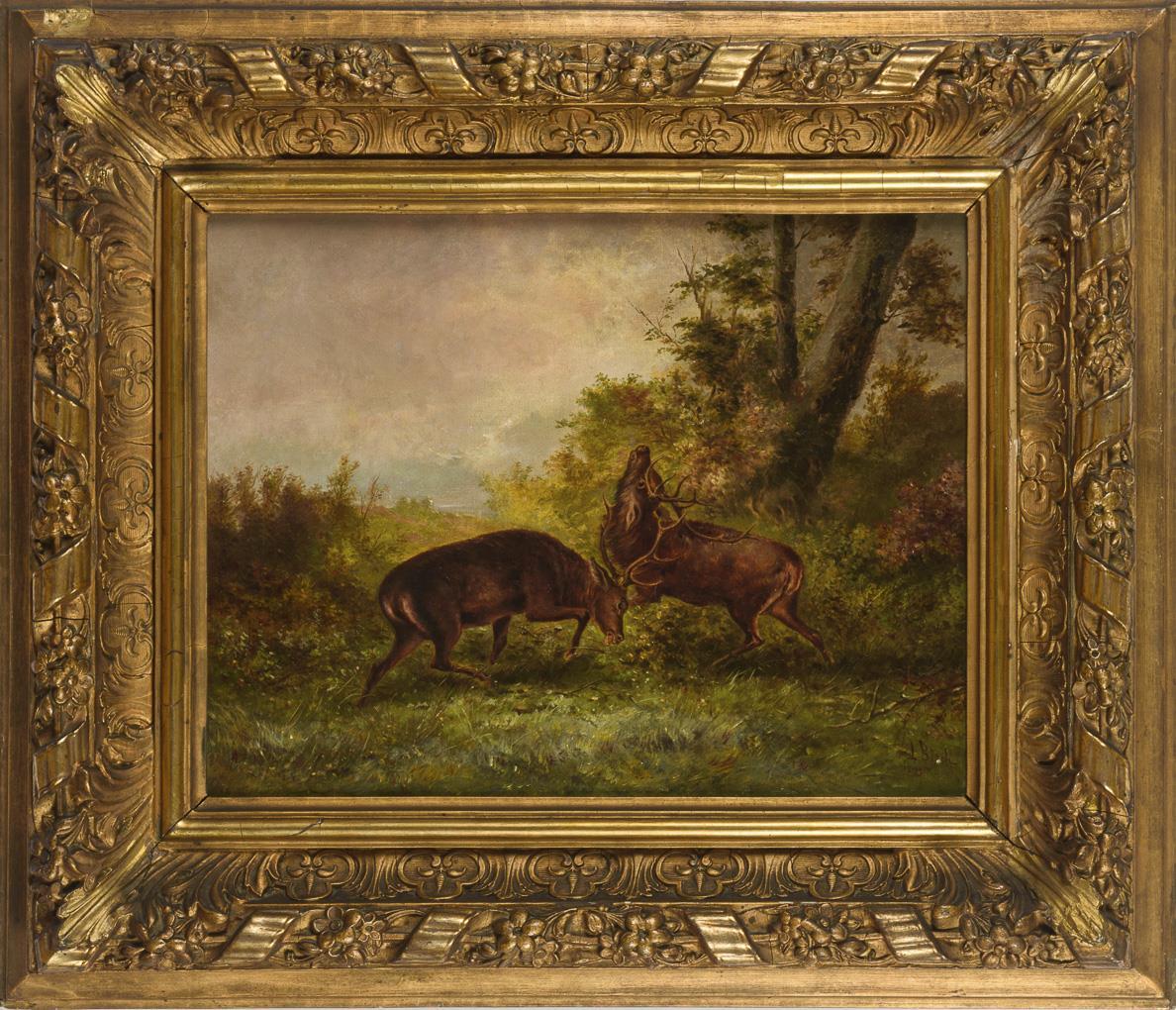 Zwei Hirsche am Waldrand im Kampf. Eine kleine restaurierte Stelle mit Hinterklebungen.