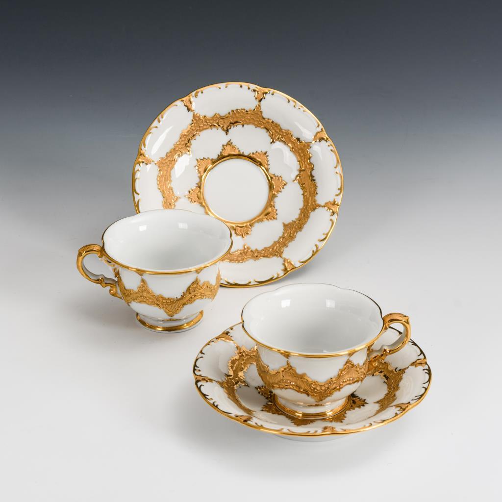 Weiß mit teils bronzierter Goldstaffage.H Tassen 5,5 cm, Ø originale Untertassen 13 cm.