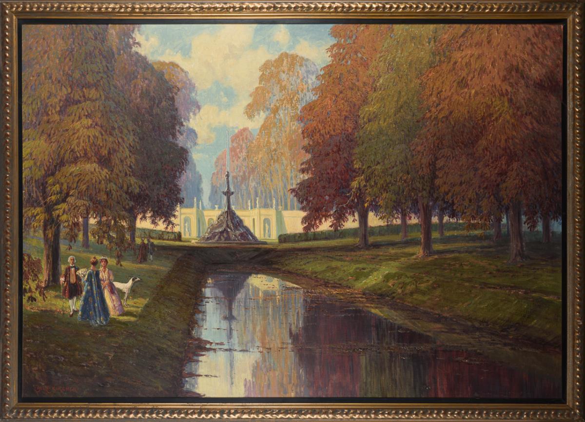 Schloßparkgelände mit Staffage am Kanal vor dem Brunnen und der Mauer im Sonnenschein. Zwei kleine Defekte.