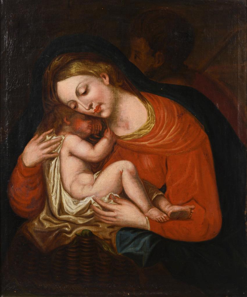 Die Muttergottes mit dem schlafenden Jesuskind in den Armen. Eine restaurierte Stelle mit Hinterklebung.