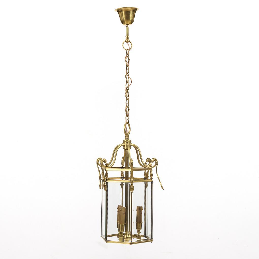 3-flammige Deckenlaterne mit 6-eckigem Korpus mit geschweiften Streben, an Kettenaufhängung mit Glockenbaldachin. Leichte Alters-/Gebrauchsspuren.