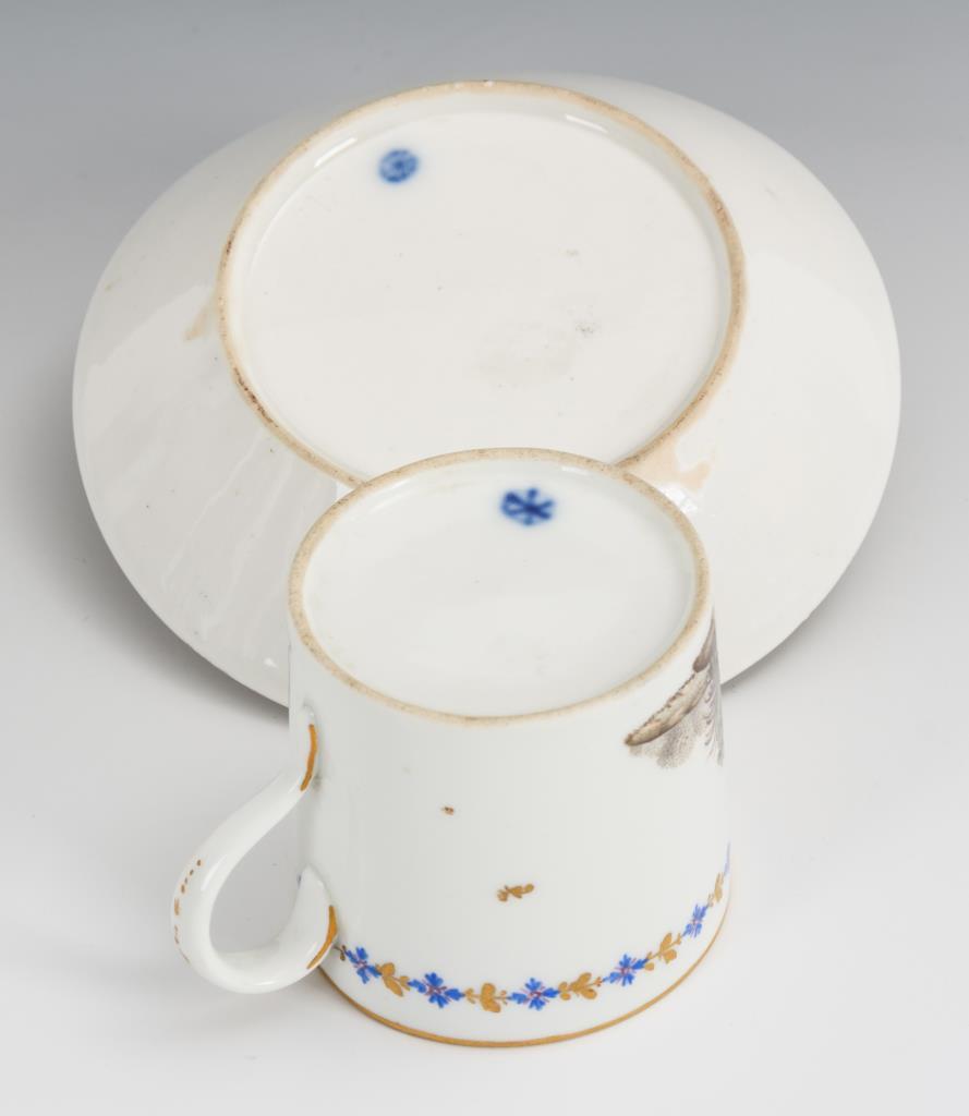 Zylindertasse mit Ohrenhenkel. Schauseitig sowie im Spiegel der Untertasse eine Landschaftsinsel mit Wiedehopf. Partieller Goldabrieb, Brandriss in der Untertasse.