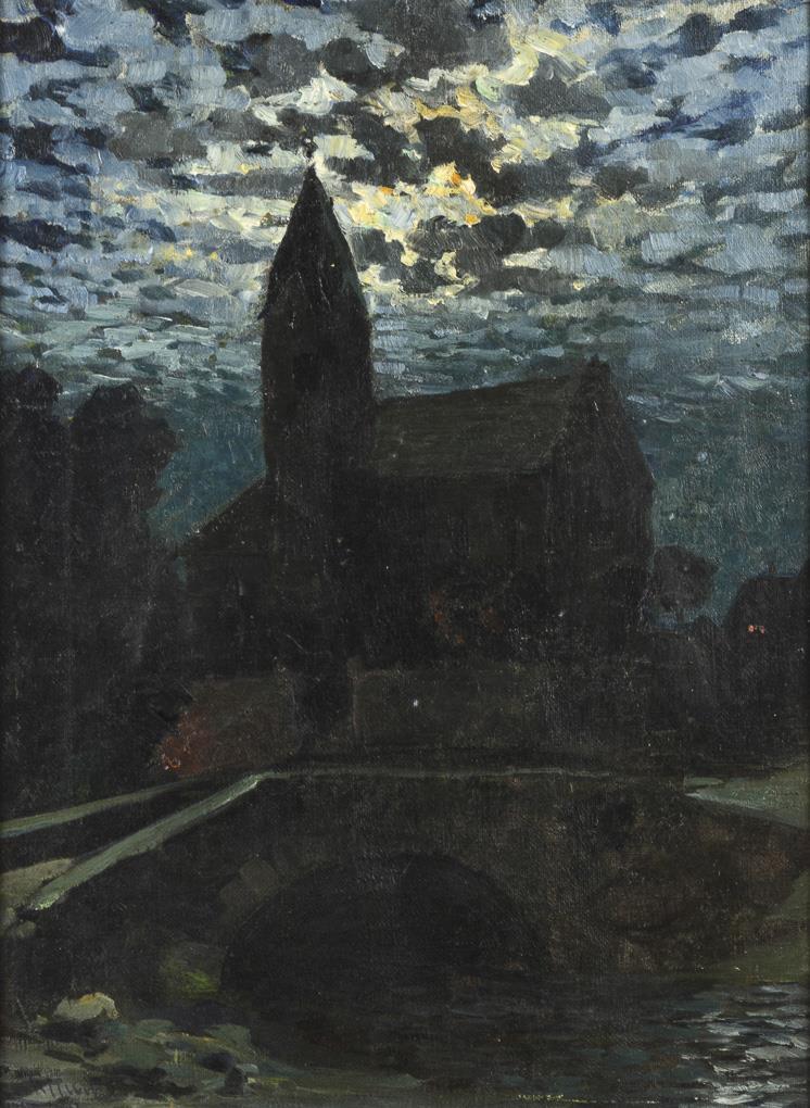 Undeutlich signiert: Nachtlandschaft mit Kirche bei Mondschein