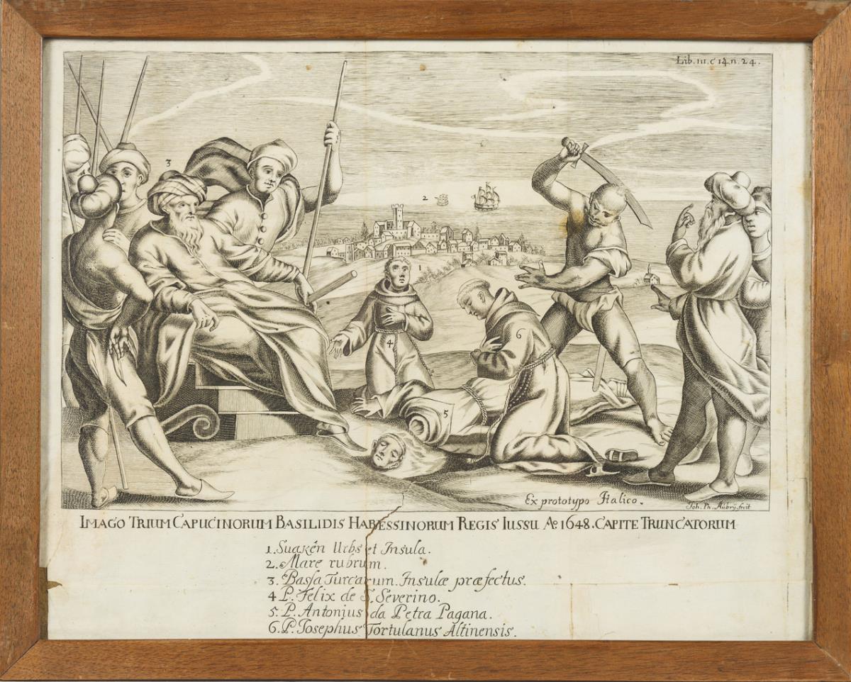 Darstellung der Hinrichtung von drei Brüdern der Kapuziner unter Basilides, König der Habessines im Jahr 1648, bezeichnet "Imago Trium Capucinorm Basilidis Habessinorum Regis Iussu Ao 1648. Capite Trun Catorum", mit Legende; aus Hiob Ludolfs "Historica Aethiopica", 1681. Blatt mit Knicken und Rissen.