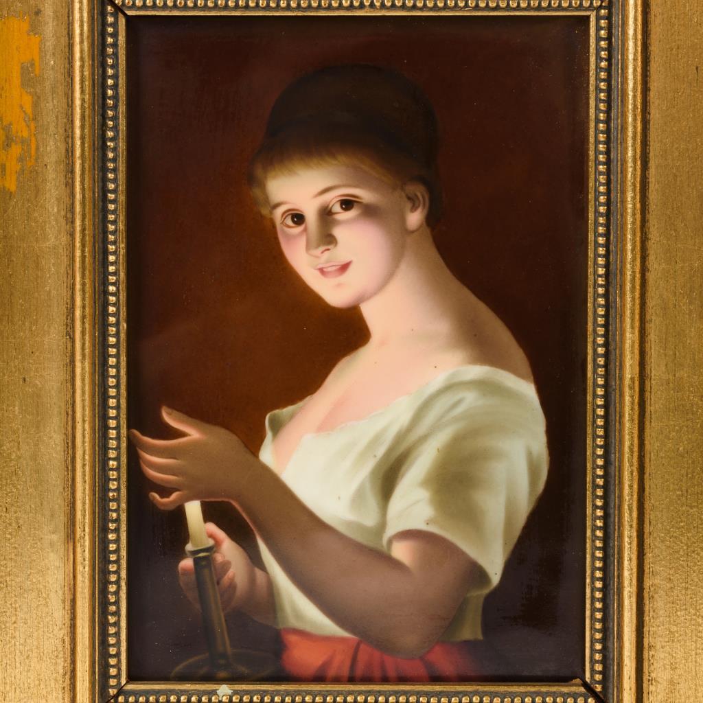 Rechteckige Platte mit der Darstellung einer jungen Frau im Nachtgewand, die Hand schützend vor ein Kerzenlicht haltend, nach einem Gemälde des Malers Georg Hom (1838-1911).