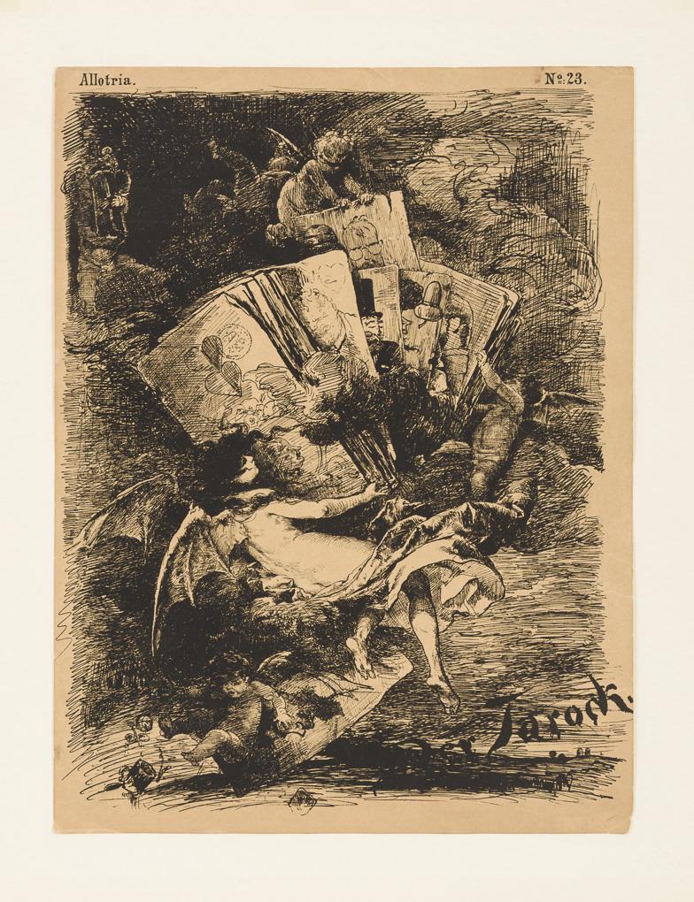 Geflügelter weiblicher Akt, Tarockkarten mit Darstellungen bekannter Münchener Malerfürsten in der Hand haltend; aus: Kneipzeitung der Münchener Künstlergesellschaft Allotria; verso mit humorvollem Begleittext in Sütterlin "Der Tarock.". Griffspurig, verso mit Klebespuren.