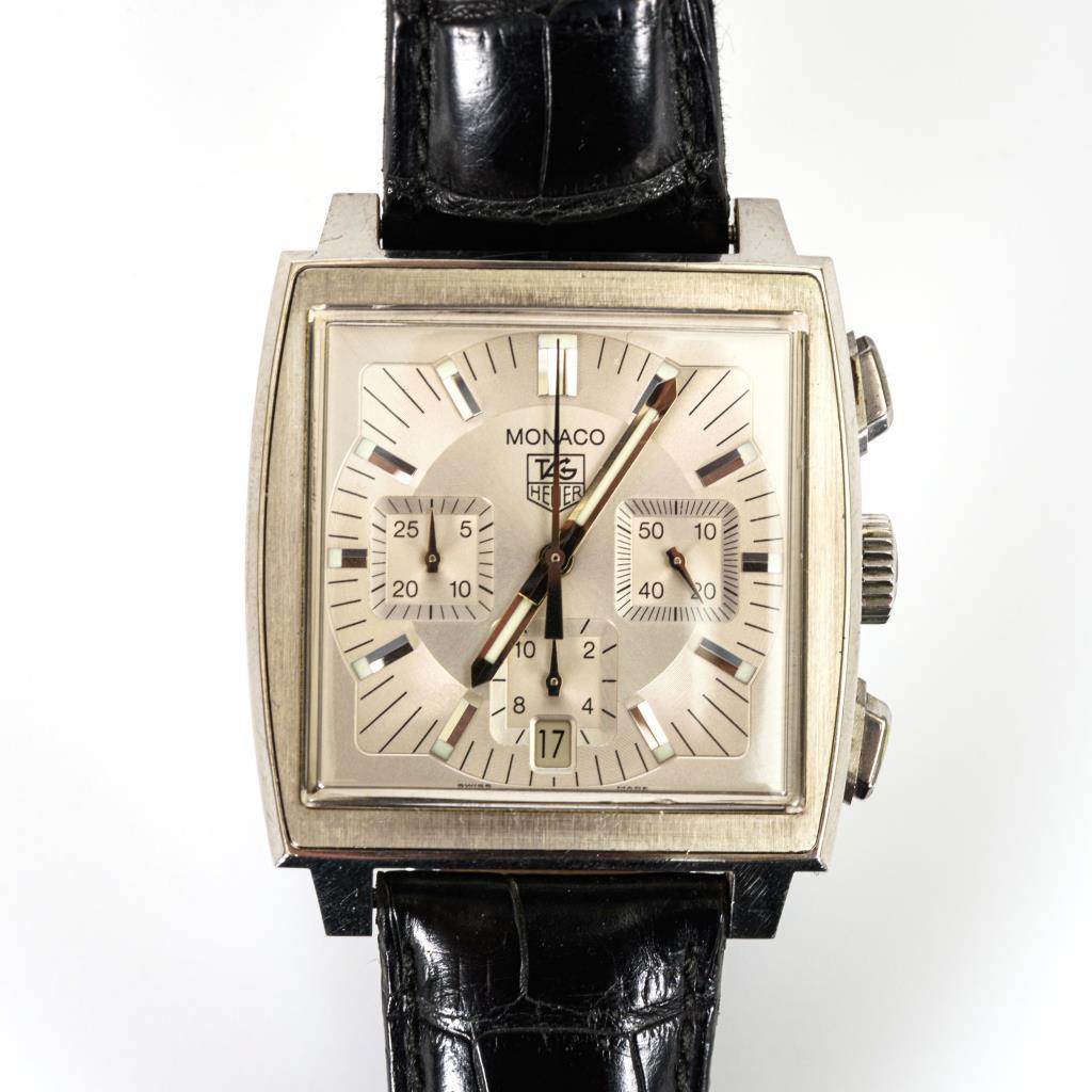 Gehäusenummer: DW8168.Referenznr.: CW2112-0.Automatikwerk mit Federkrone.Silberfarbenes Zifferblatt mit fluoreszierenden Stundenindizes und Stabzeigern, Minuterie, Hilfszifferblätter Sekunde, 30-Minuten und 12-Stunden, Zentralsekunde für Stoppuhrfunktion.Herstellerprägung Anzeige: "Tag Heuer, Monaco".